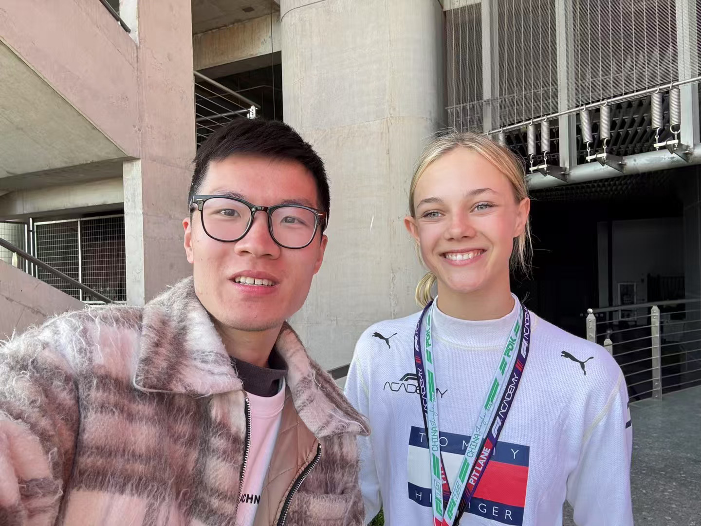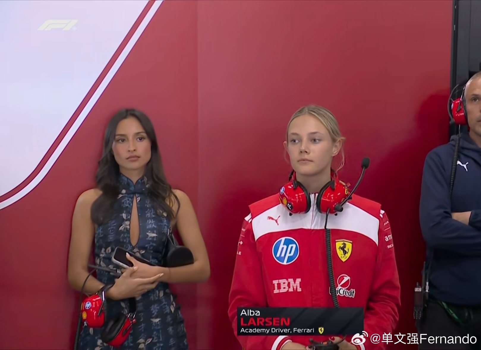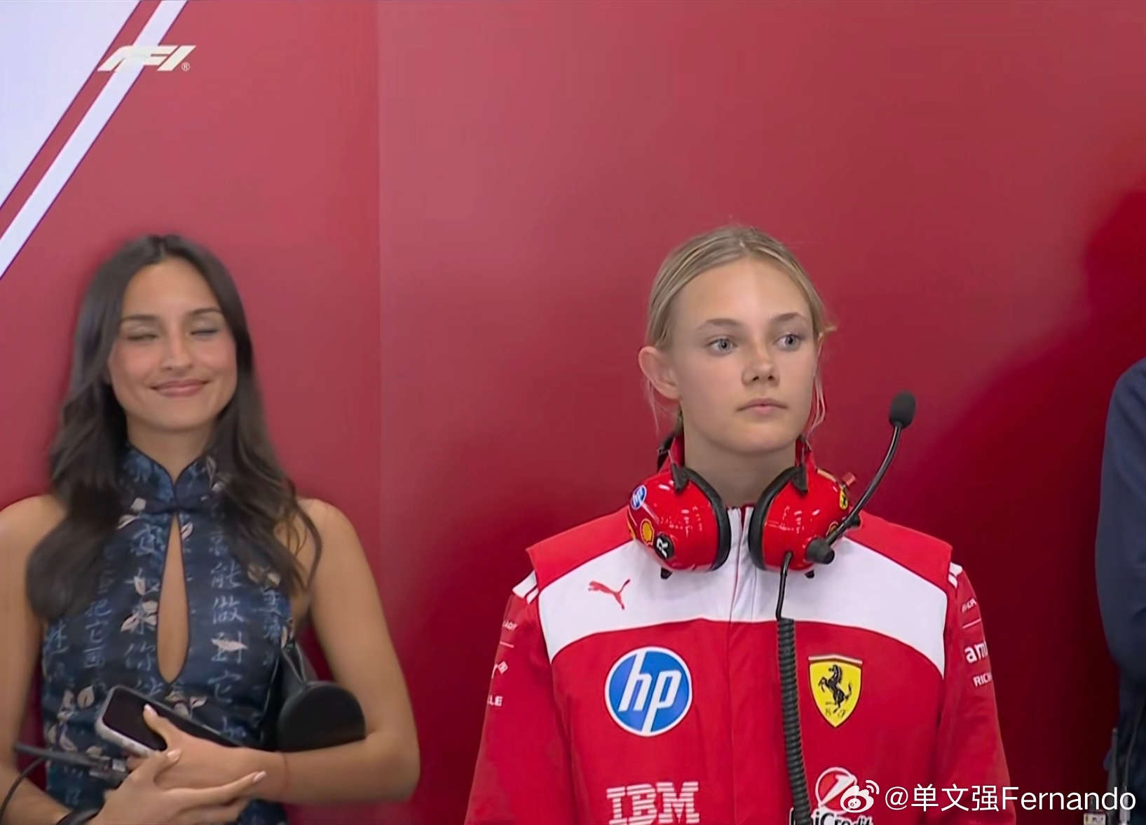 F1冲刺排位赛 阿尔巴·拉森!!!在F1冲刺排位赛SQ1结束后,转播镜头给到了法拉利P房,给到了学院女车手Alba(去年在F1中国大奖赛在上海站就遇到了Alba,丹麦天才女车手)勒克莱尔的妻子Alexandra站在Alba旁边