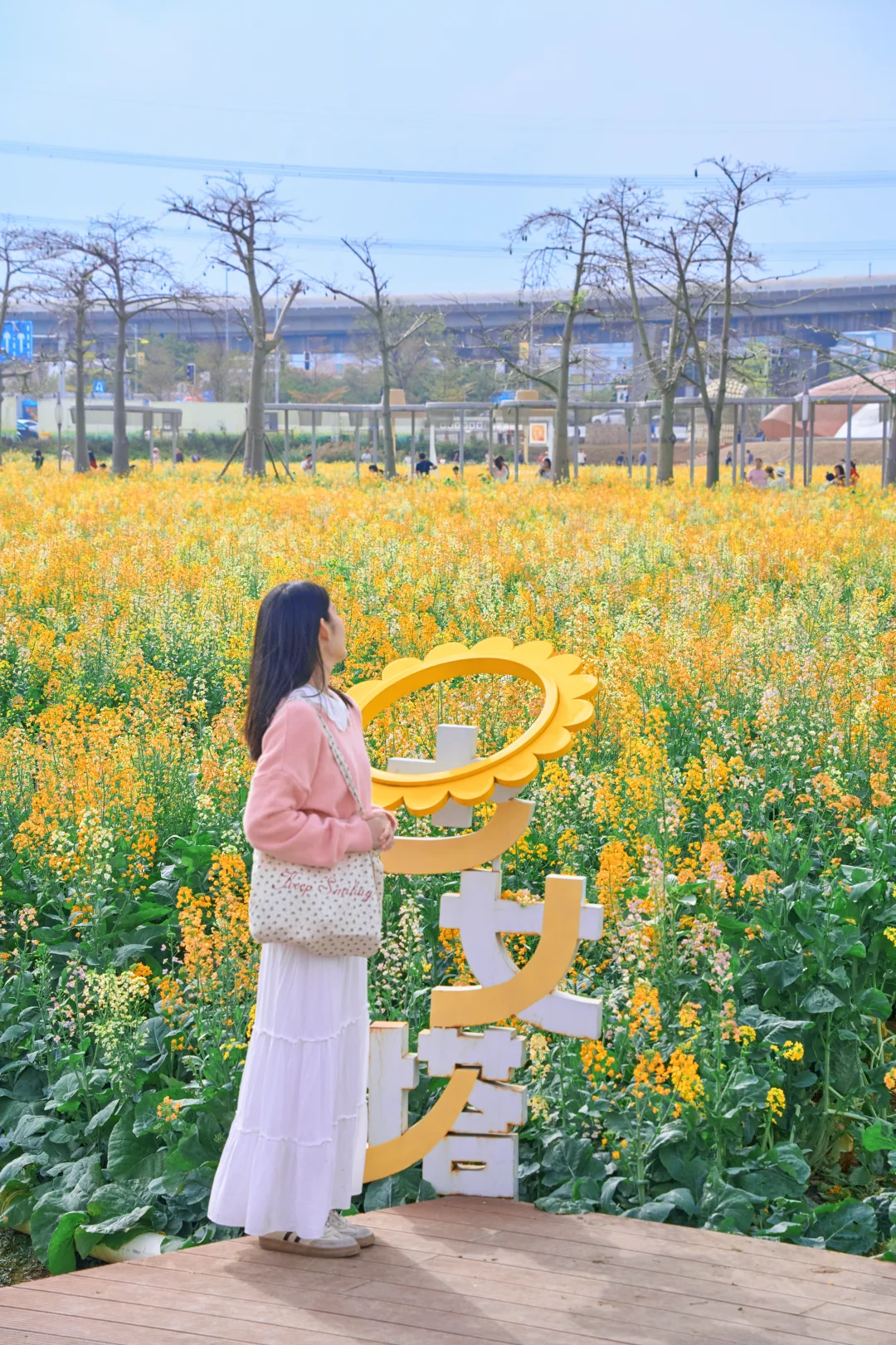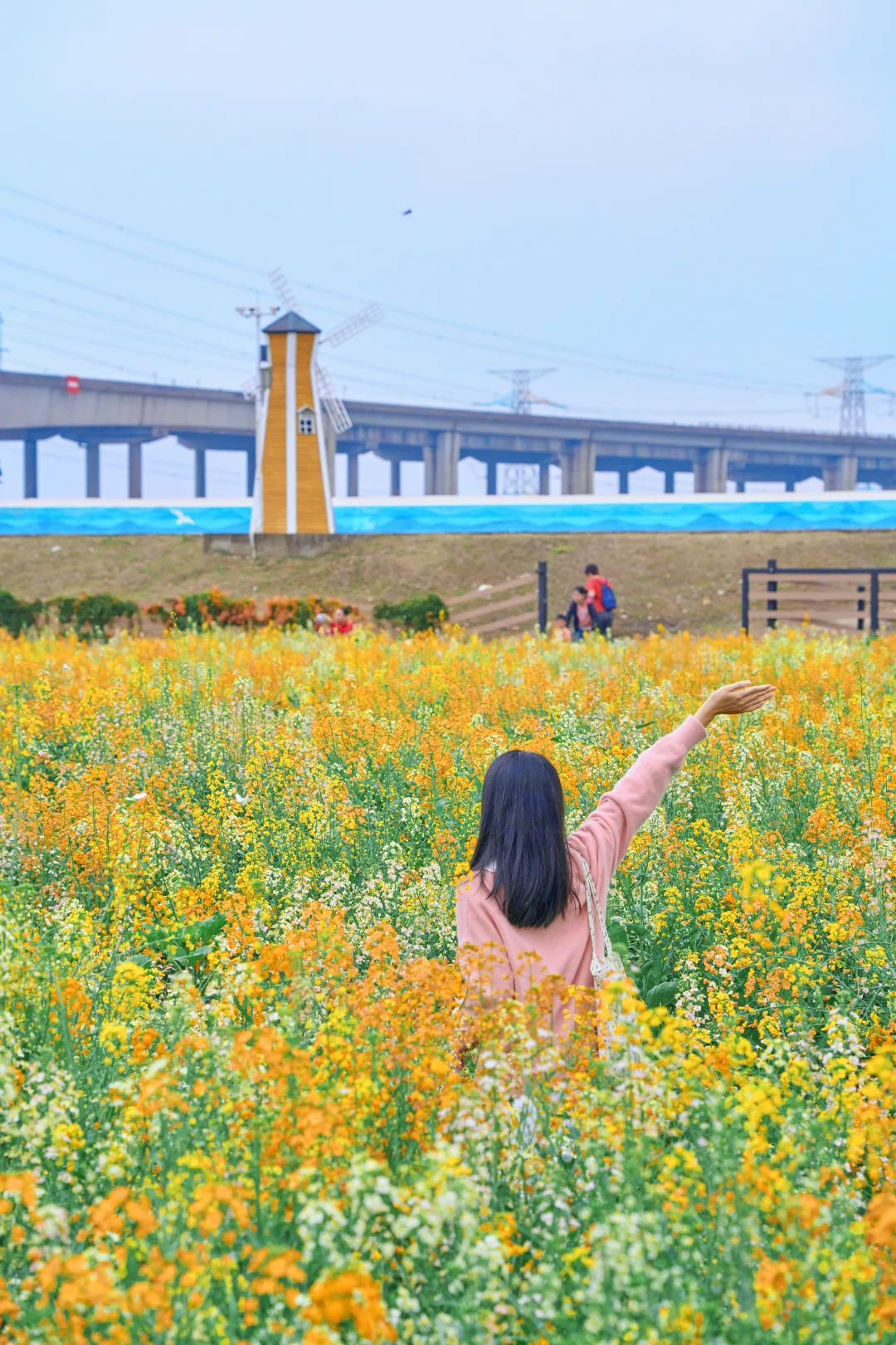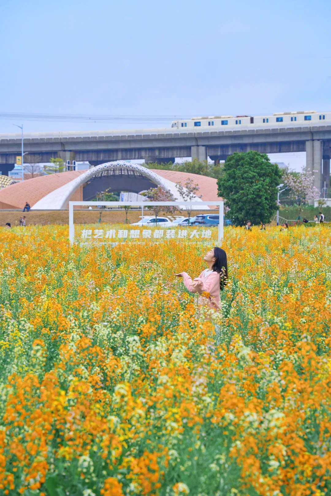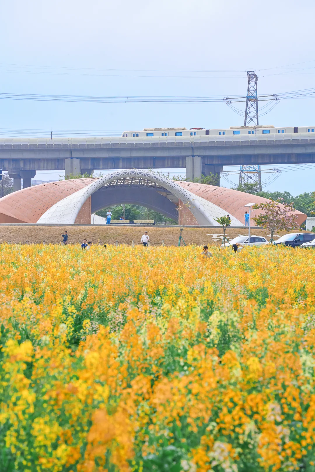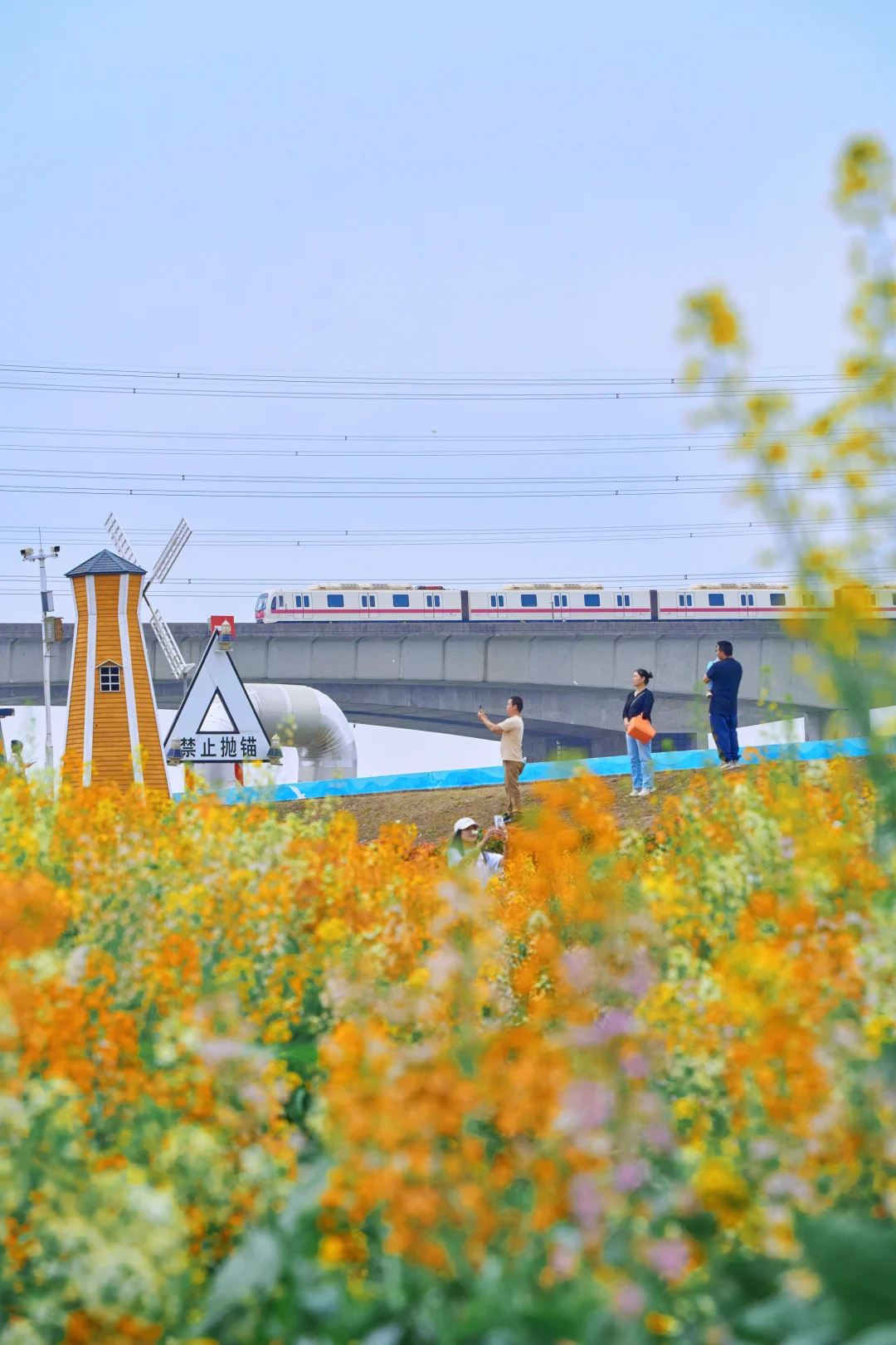 远处高架桥上方,4号线的列车每隔几分钟呼啸而过🚅车厢穿梭在花海之间🌼简直是漫画里的春日场景直接照进现实~