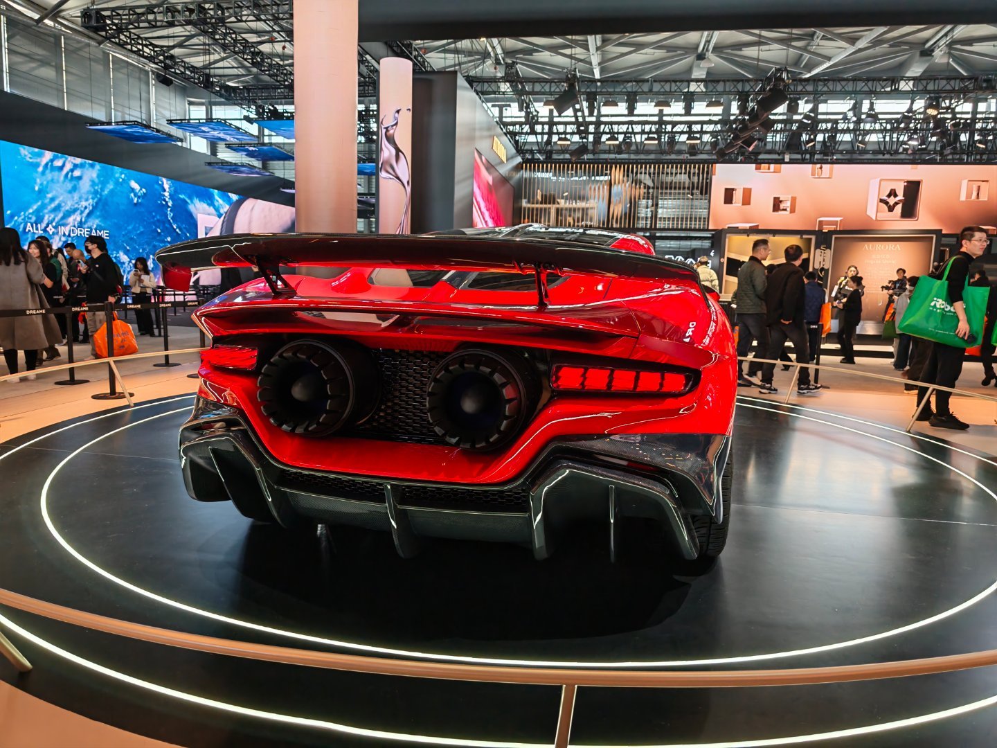今天在AWE车展直接被追觅汽车色跑车震撼到了,从后面看那个大尾翼和双边四出排气,甚至还有飞机才有推进器,简直像随时要冲出去赛道一样,围观的人多得挤不动,国产车现在这么炸了吗?