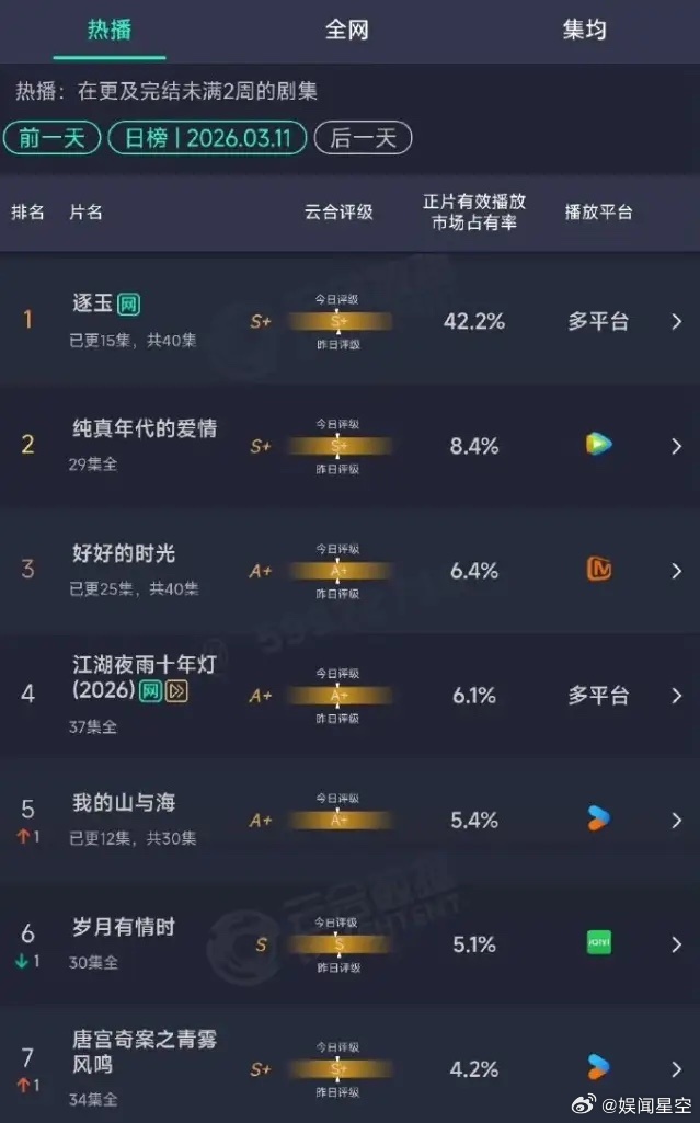 双平台和粉丝硬刚!《逐玉》双平台热度均破万,云合占比42.2%,播放量8700万,几乎吸干大盘,但是最近一直被质疑注水,甚至被举报,不过爱奇艺这边给出了回应,说数据真实可信,而腾讯这边也疑似回应数据注水,宣传海报写的是“无添加不兑水”。