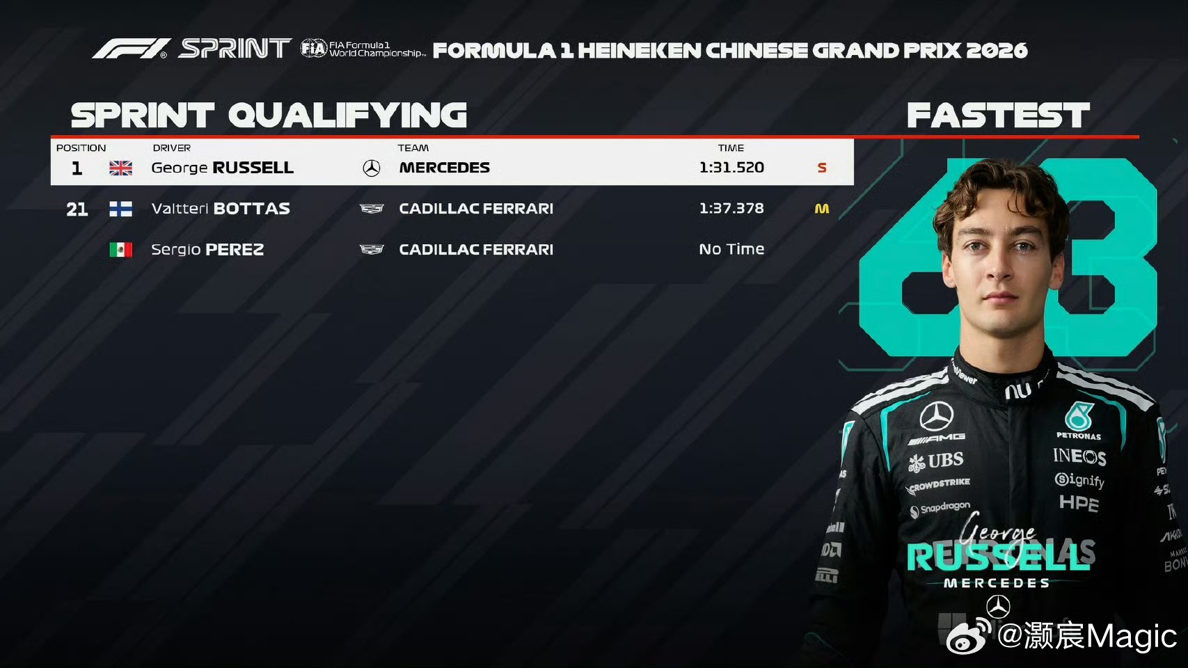 F1世界锦标赛 本赛季首场冲刺赛排位赛结果揭晓。拉塞尔强势以1:31.520的最快圈速夺得杆位,安东内利落后0.289秒排在第二,诺里斯落后0.621排在第三,汉密尔顿第四,皮亚斯特里第五。