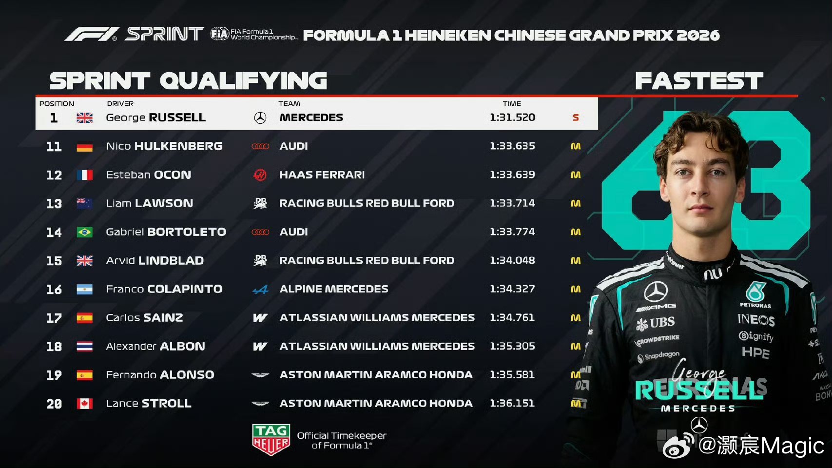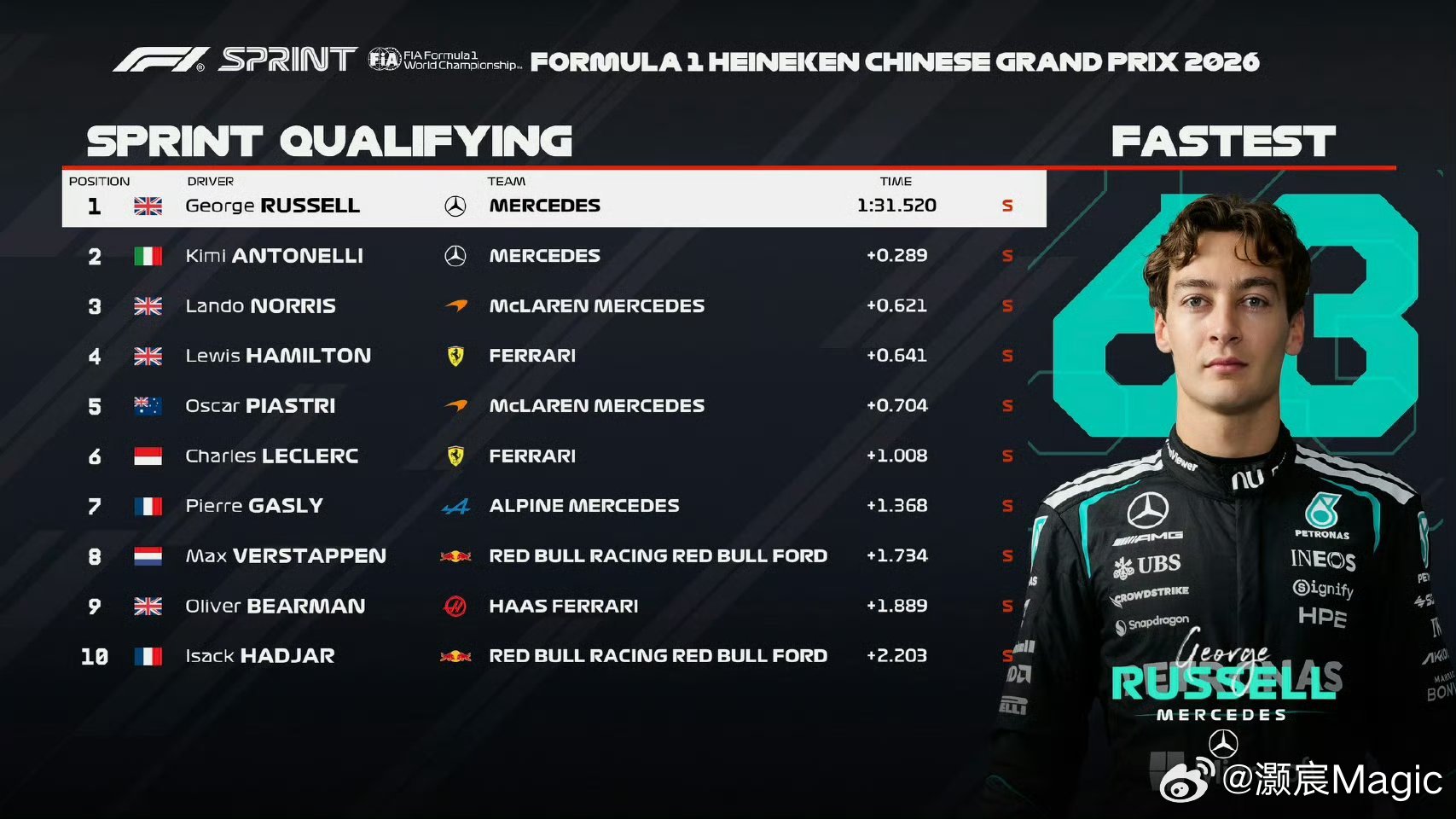 第六到第十分别为:勒克莱尔、加斯利、维斯塔潘、贝尔曼、哈贾尔。明天上午11:00,冲刺赛准时起跑!不见不散!