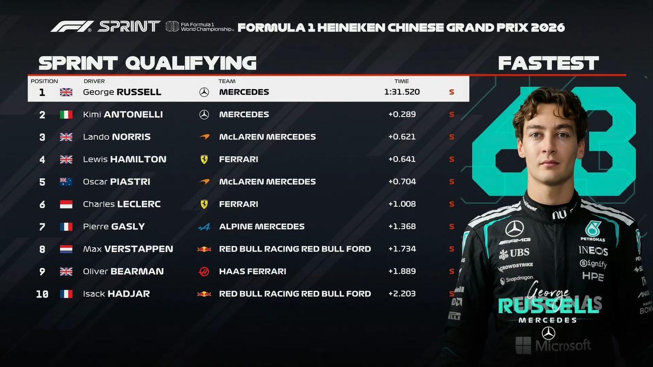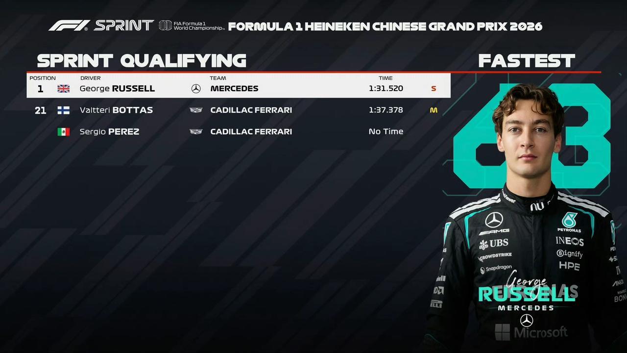 梅奔车队的优势太大了,拉塞尔夺得冲刺赛杆位,领先第三名多达0.621秒。 梅奔在上海的冲刺赛也是包揽头排发车,感觉今年的F1或将提前大结局了。 令人失望的是法拉利,老汉和乐扣分列第四和第六,不是说带了尾翼吗?还有我们关心的凯迪拉克就是去当陪练的,有成绩纪录就算不错了。