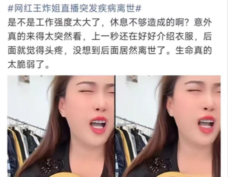 39岁女网红“王炸姐”去世。 生命很脆弱,一瞬间倒下不是说说而已。爱惜自己吧!不要太用力的消磨身体,因为身体健康才是最重要的。 谁不想活的舒服点,车贷房贷生活各种开销压得喘不过气! 生老病死,自然规律。王炸姐一路走好! 生活不易,竞争激烈,松弛有度,劳逸结合,且行且珍惜。