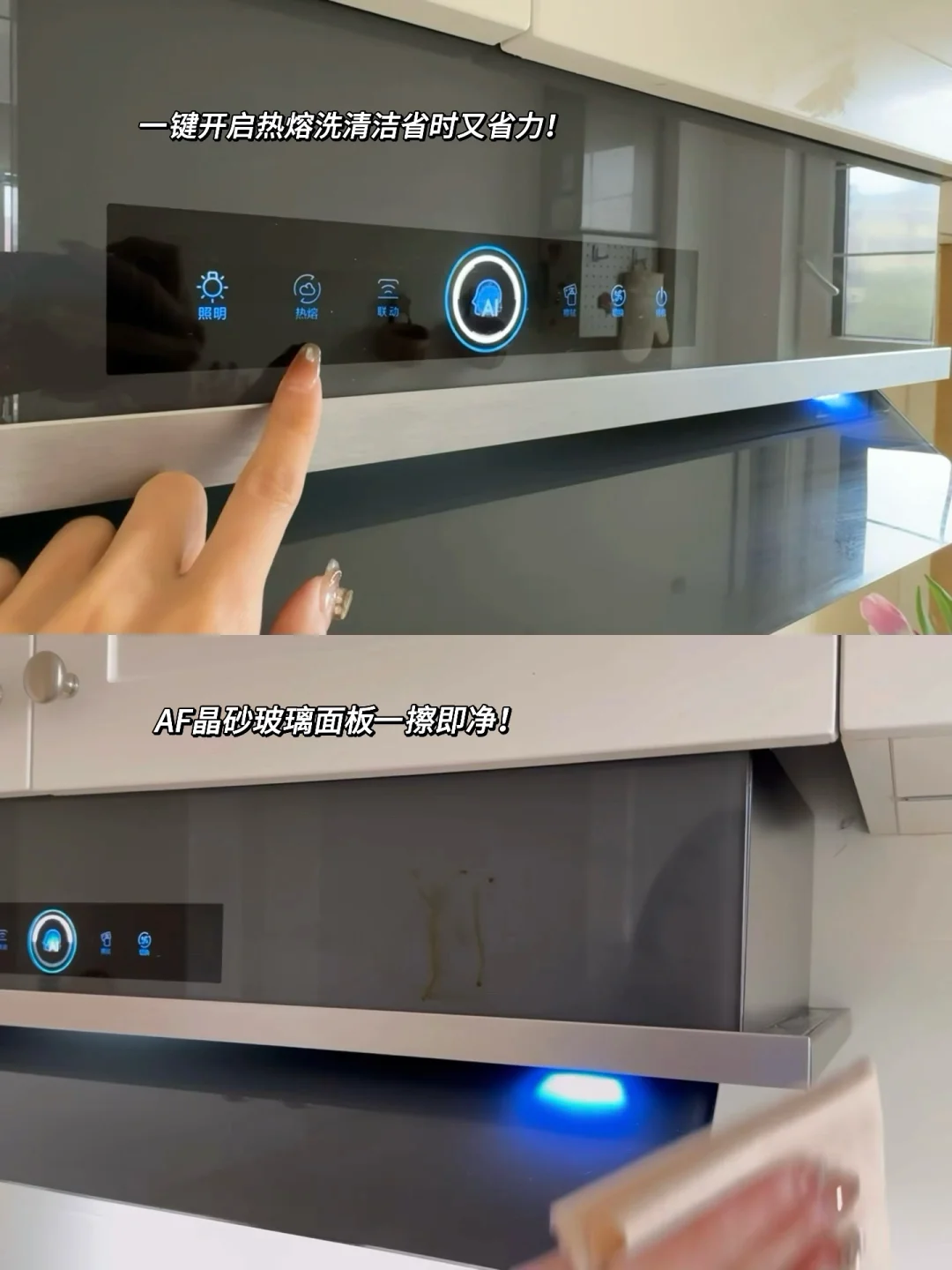 油烟机的清洁问题是最让人头疼😩,但它极夜灰AF晶砂玻璃面板不沾指纹、油污,一擦就干净~👍最省心的是它的热熔洗自清洁模式,高温自动熔解内部油污并排走,不用拆机磁吸油网易拿取,随手一拆一冲就OK~简直就是我的省心厨电小能手!