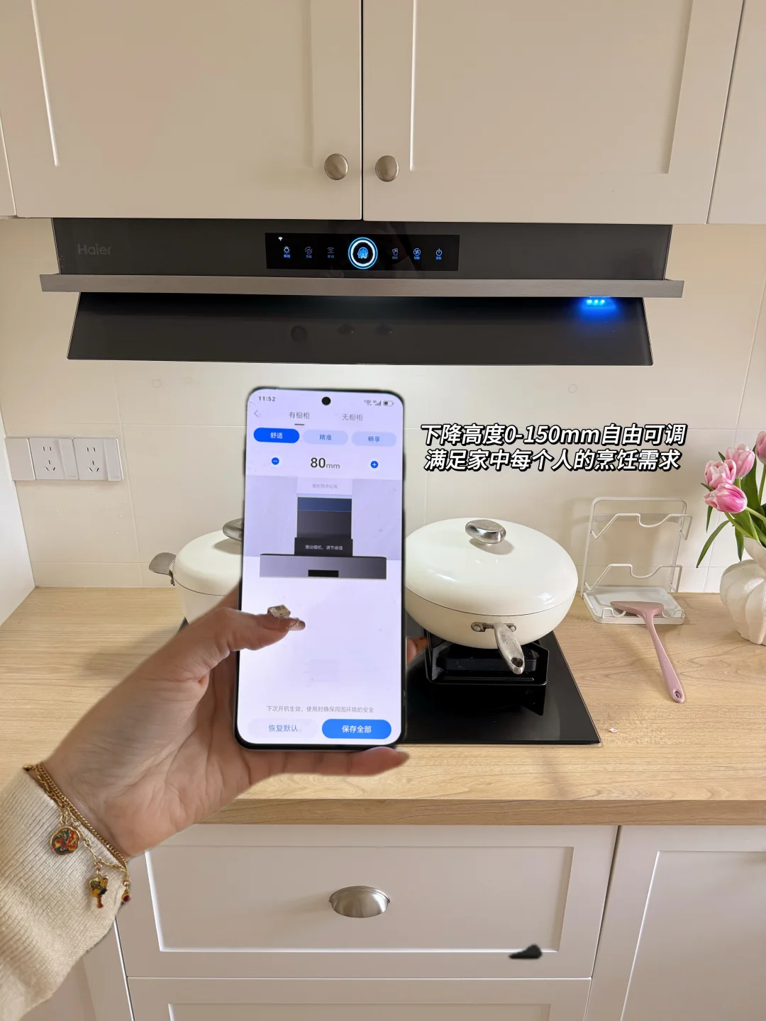 它不光省心还省力!需要它时只需要挥挥手,烟机就能自己降下来👇🏻下降的高度也能通过手机App 自由调节,0-150mm满足家中各种烹饪需求~机身也只有325m,能全嵌隐藏于吊柜,正面看完全隐形厨房看起来整洁又美观✨,不档视线不占空间。