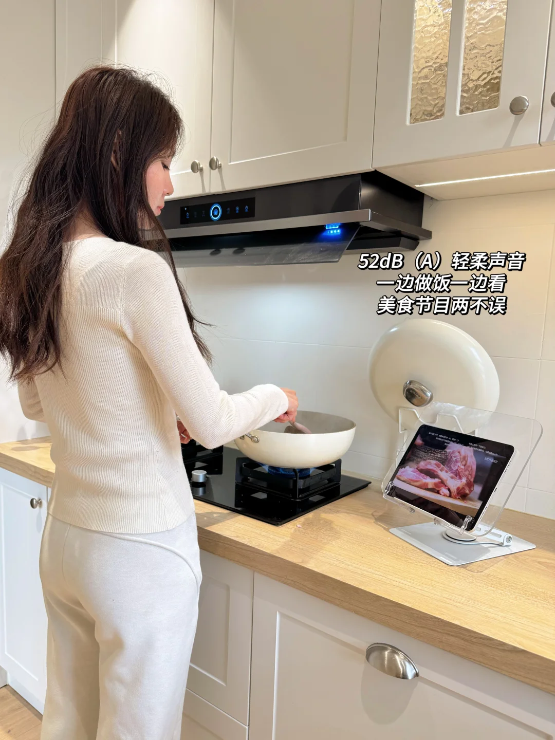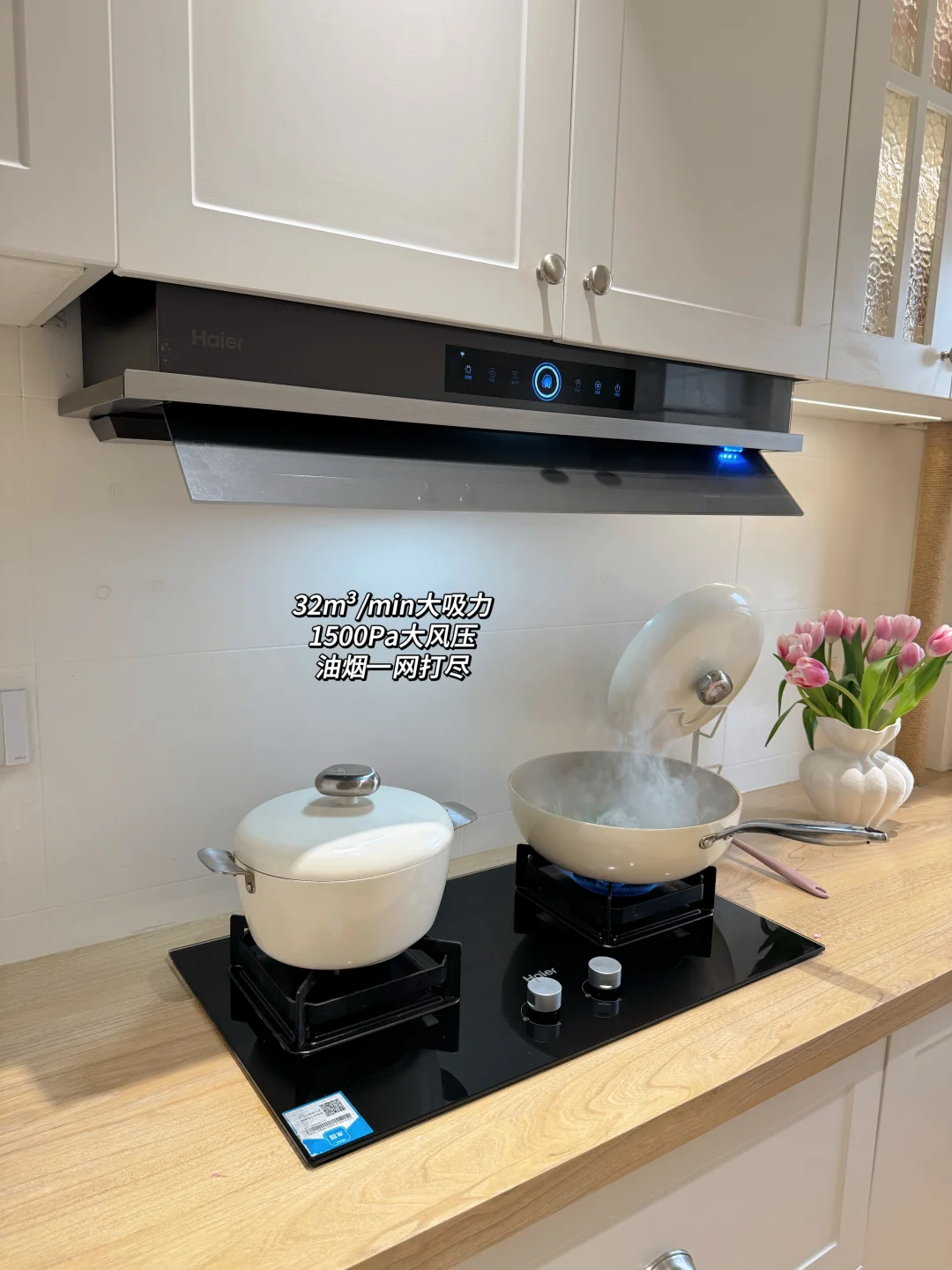 当然买烟机还是要把油烟吸干净🌬️。这台烟机直接把排烟做到极致:32m³/min暴风吸力+1500Pa超强风压,搭配135°大角度拢烟板,油烟刚冒头就被牢牢锁住,爆炒各种辣🌶️的菜也闻不到一点呛味。吸力强劲的同时运行仅52dB(A),炒菜时接电话、看美食教程完全不受干扰👂