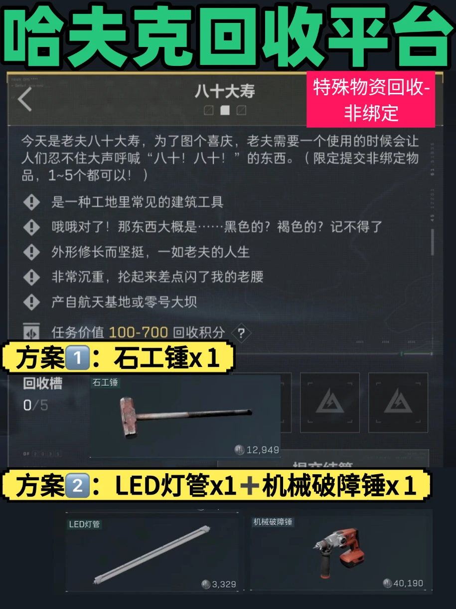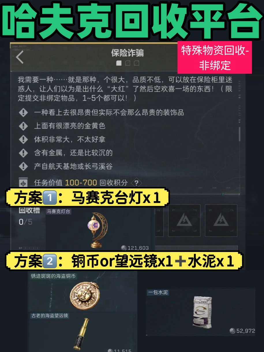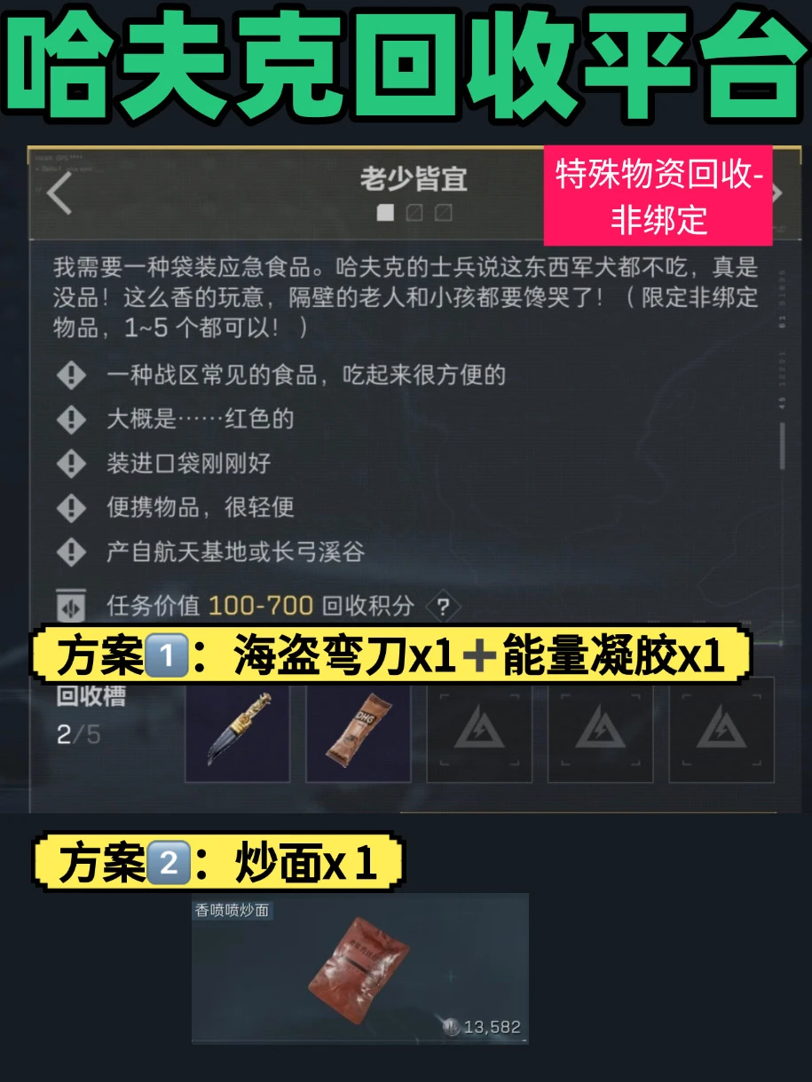 三角洲行动|哈夫克回收平台提交攻略来了,都是非绑定不要丢掉哦! 👦老少皆宜 ✅ 方案①:香喷喷炒面 ✅ 方案②:海盗弯刀+清新橘味能量凝胶 💼保险诈骗 ✅ 方案①:马赛克灯台 ✅ 方案②:海盗铜币/海盗望远镜+水泥 🧓八十大寿 ✅ 方案①:石工锤 ✅ 方案②:LED灯管+机械破障锤