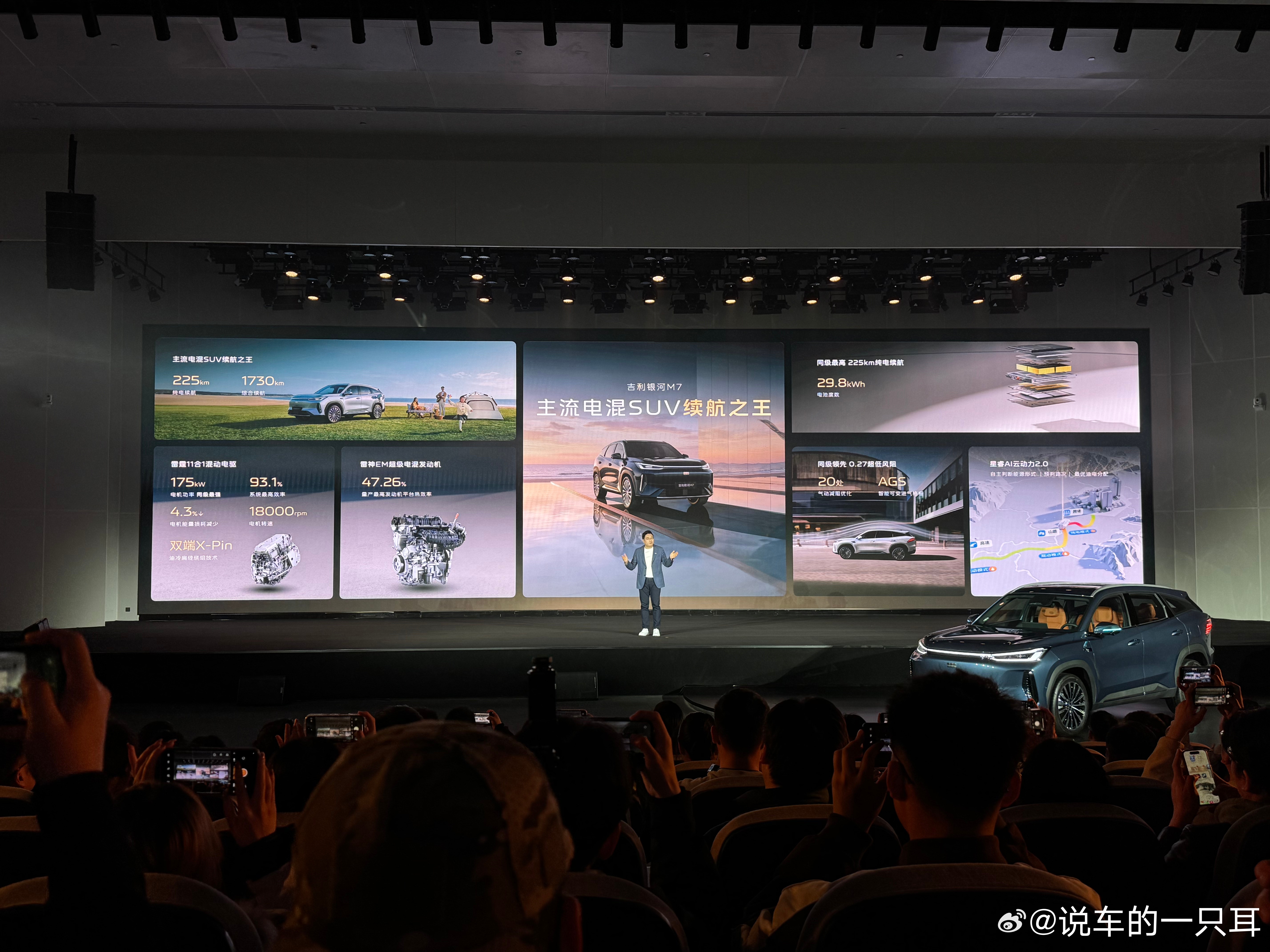 紧凑级混动车也能用上超充电池了。刚才结束的银河M7技术发布会,我圈圈重点:1、神盾金砖电池上车了,而且以后吉利银河的混动车型将逐渐铺开换装。(其实我刚知道这个事的时候也有个疑问:“我今天吃了妈妈做的菜,有什么特别的不……”如果你和我有一样的疑问,往下看);2、在银河M7上的神盾金砖电池在只有29.8kWh的容量下,纯电续航可以到225km(其实在紧凑级车的重量和尺寸下,这个表现倒也正常,但这个容量的电池一般不会出现在紧凑级车上,这个有意思);3、这块电池可以做到30%~80%充电15分钟完成(紧凑级混动车一般不会有这么快的充电速度,这个是换装神盾金砖电池的最大意义,说白了,紧凑级混动车也能用上超充电池了);4、配上燃油,它的综合续航能到1730km(这个不解释了)。其他的,阻尼自适应悬架(我猜是fsd)、后备箱盖板下128L隐藏空间、双层夹胶玻璃、23扬声器的FlymeSound等等。我开始好奇这台车要卖多少钱了。PS:200km+只是神盾金砖电池的入门级,后面会有300km+、400km+版本。吉利银河m系新成员来了