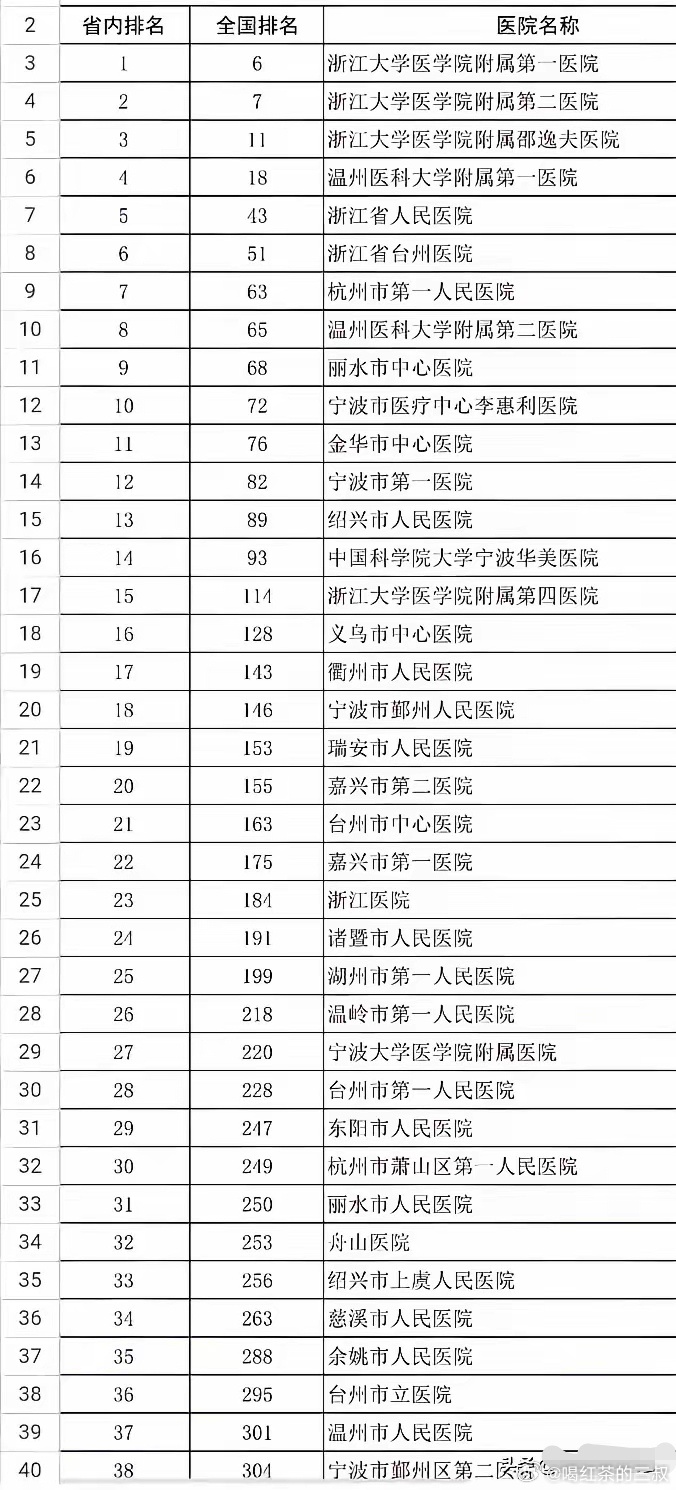 网上看到,应该是最近某个年份的浙江医院排名。综合性三级医院排名,不包括中医、妇幼