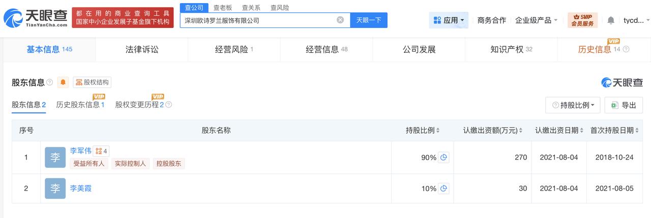 去年315曝光问题一次性内裤企业现状 去年315曝光问题一次性内裤企业已注销 去年3月15日,央视3·15晚会曝光不灭菌的一次性内裤问题,多家企业被点名。一年后,被曝光的企业现状如何? 天眼查工商信息显示,遭315晚会曝光的深圳欧诗罗兰服饰有限公司成立于2018年10月,法定代表人为李军伟,注册资本300万人民币,经营范围包括女士、男士、纺织品、针织品等。股东信息显示,该公司由李军伟、李美霞共同持股。风险信息显示,2025年3月,该公司因通过登记的住所或经营场所无法联系被列入经营异常名录。 另一家遭315晚会曝光的虞城县雅恒服装加工厂成立于2023年5月,经营者为林桂琴,企业类型为个体工商户,经营范围包括服装制造、家用纺织制成品制造、卫生用品和一次性使用医疗用品销售等。目前该企业已注销。 天眼查信息: