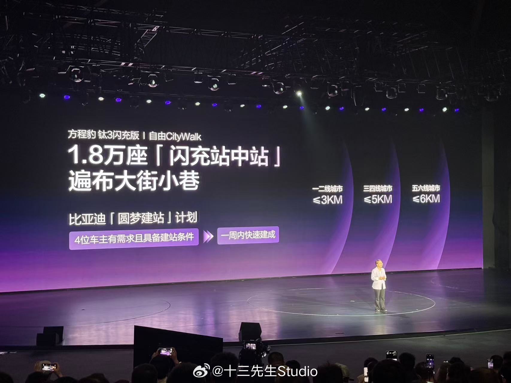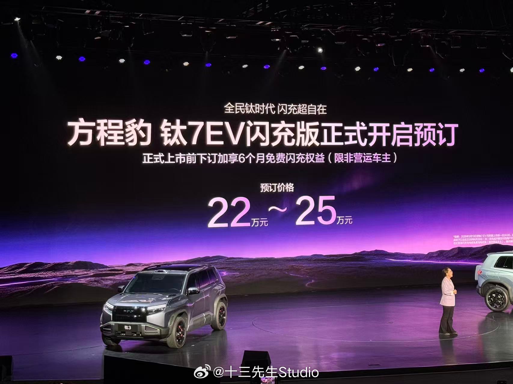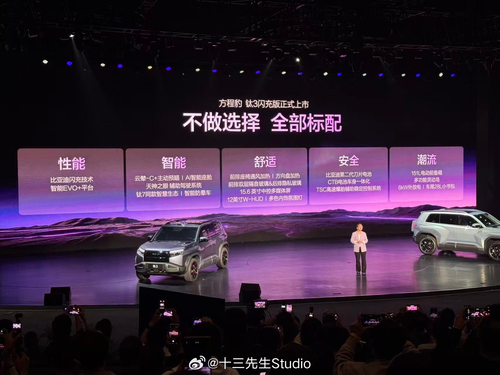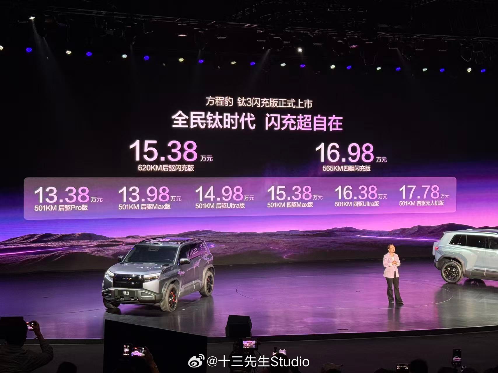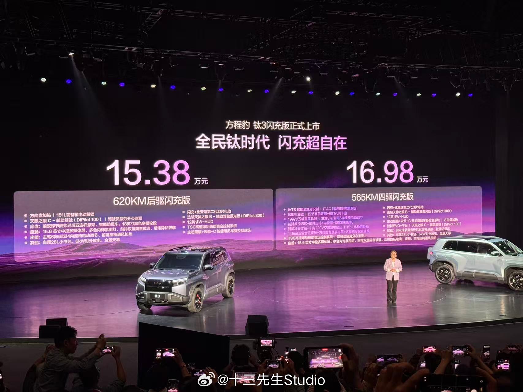 方程豹钛3闪充版正式上市,推出620KM后驱和565KM四驱两款车型,售价分别为15.38万-16.98万。搭载比亚迪第二代刀片电池及闪充技术,4月13日前下定用户可享受18个月免费闪充。同时,钛7EV闪充版也开启预订,预订价格为22—25万元。方程豹钛3闪充版上市发布会钛3定位都市精品紧凑SUV,外观兼顾圆润与肌肉感,长宽高分别为4605/1900/1720mm,轴距为2745mm。内饰配备8.8英寸全液晶仪表盘和15.6英寸中控屏。搭载压缩机冷暖冰箱,支持制冷-6-6°C、制热35-50°C。还搭载帝瓦雷音响、车载KTV麦克风、车载手电筒、星环氛围灯、多功能灵动岛等。动力方面,钛3闪充版配备双电机,前后电机最大功率分别为135千瓦和240千瓦,最高车速210km/h,纯电续航620km。新车搭载第二代刀片电池+闪充技术,10%-70%充电仅需5分钟,10%-97%充电仅需9分钟,零下30度20%-97%充电也只多3分钟。此外,新车还搭载iTAC智能扭矩控制系统、一键漂移、iATS智能全地形识别系统、陷车助手以及蠕行功能,转弯半径最低可至3.3米。黑科技打造豹力新体验 配备主动预瞄+云辇-C智能阻尼车身控制系统以及爆胎辅助稳停系统。智驾方面,搭载天神之眼C智驾,配备高快领航、智能泊车、遥控泊车等功能,对智驾有更高需求还可选装天神之眼B。