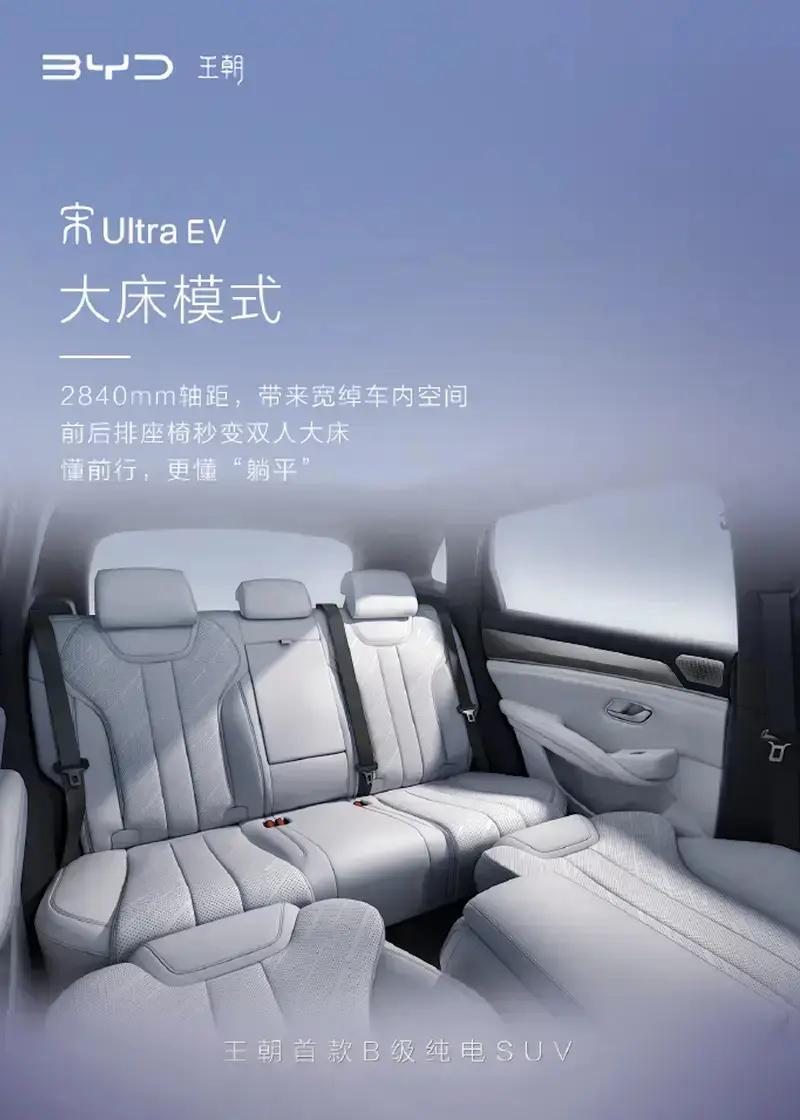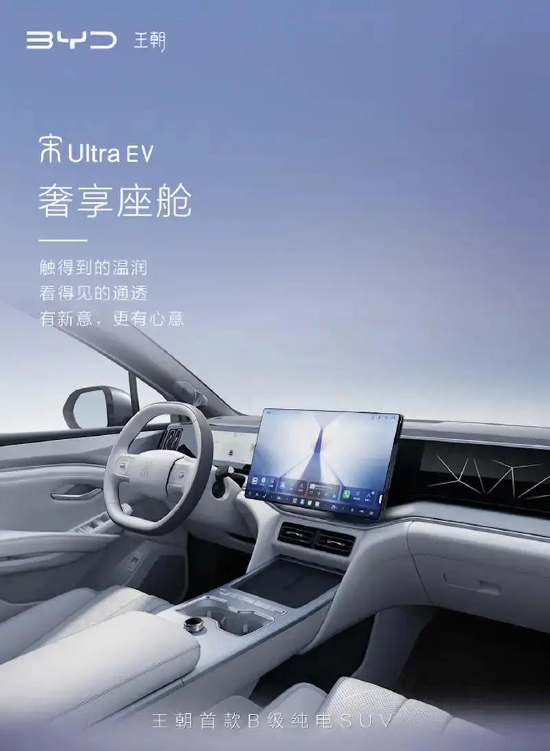 内饰方面,宋UltraEV走简洁和年轻化设计路线,提供海盐灰、暮云灰两款内饰颜色。新车全系标配15.6英寸中控大屏、四音区语音交互、手机无线充电等20+项核心配置。此外,新车还搭载敲击解锁前备箱、女王副驾、前排座椅通风+加热+按摩等。