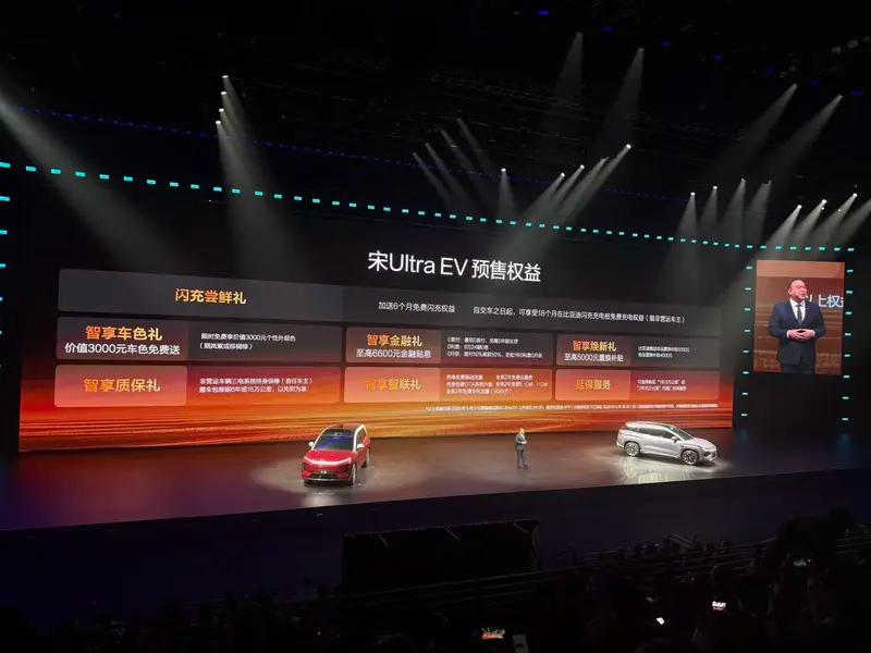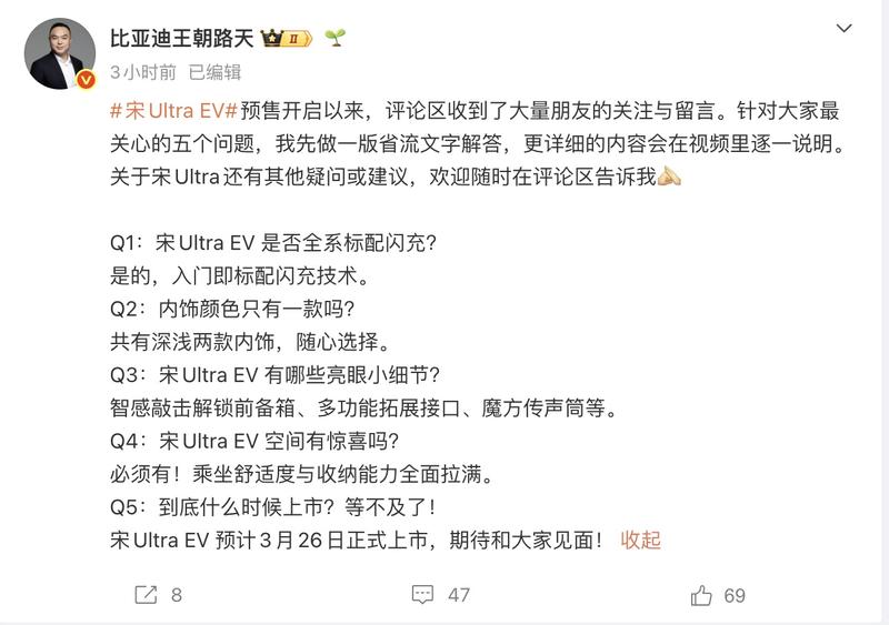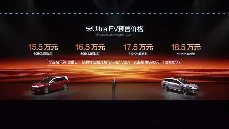 易车讯3月13日,比亚迪王朝网销售事业部总经理路天在社交媒体上表示,宋UltraEV预计将于3月26日正式上市。宋UltraEV已于3月5日开启预售,预售价15.5万元起。新车全系搭载比亚迪第二代刀片电池及闪充技术,同时配备多项奢适配置。