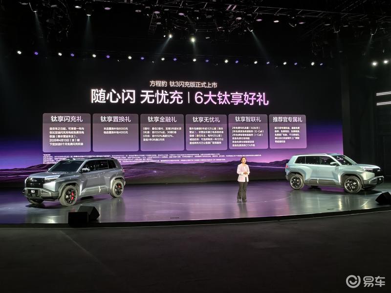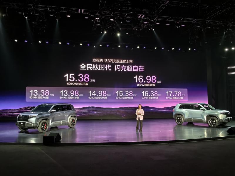 易车讯3月13日,方程豹钛3闪充版正式上市,新车共推出2款车型,售价15.38万元起。方程豹钛3闪充版还推出6大钛享好礼。新车引入了闪充技术,后驱版CLTC续航里程620公里,四驱版CLTC续航里程565公里。同时,官方表示方程豹钛7闪充版开启预订,预订价格22-25万元,并于4月上市。