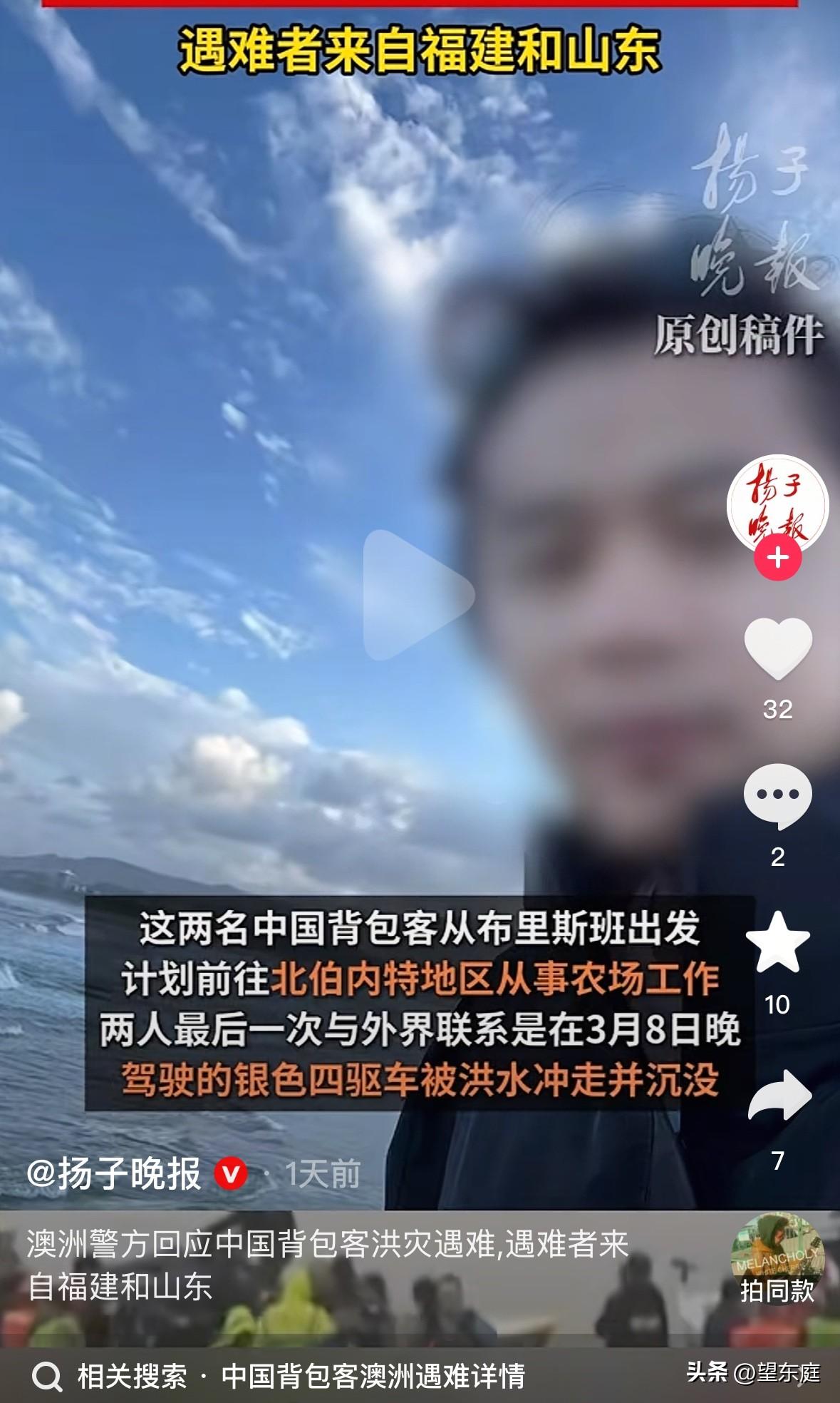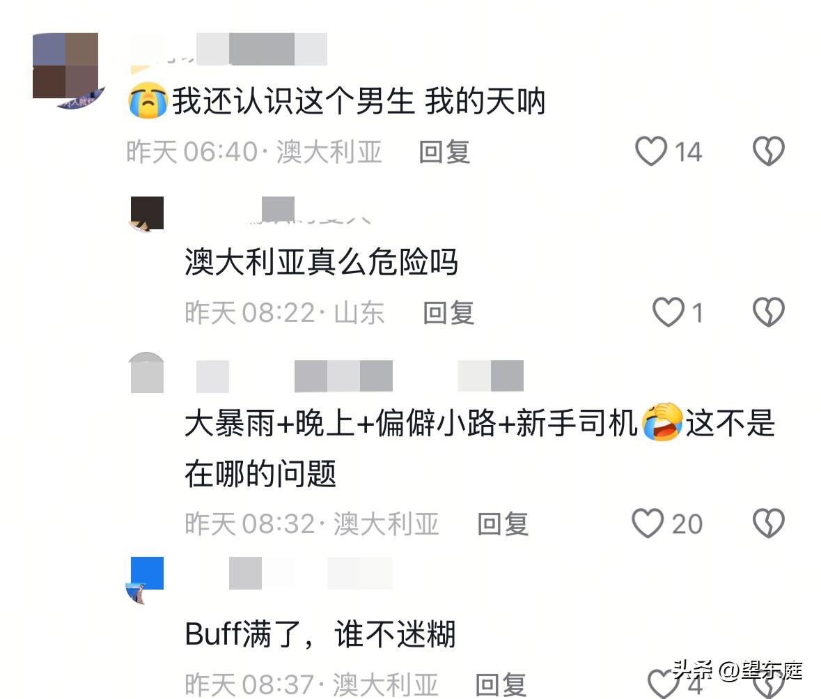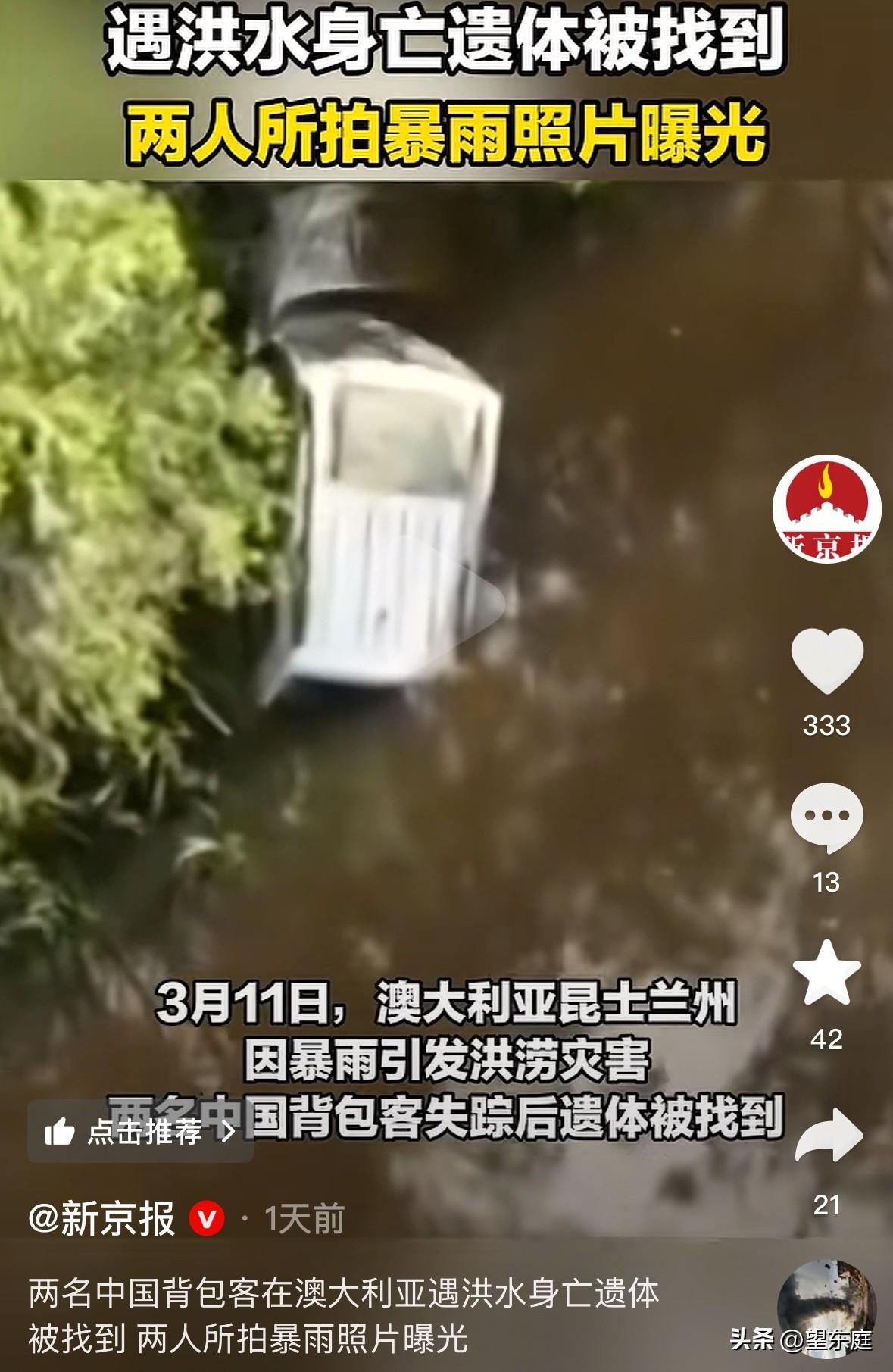 在澳洲遇难的两名中国背包客,其中一名是23岁的小姑娘!她很漂亮,离世前还曾发布了一个朋友圈:“这雨怎么这么大?天又黑,能见度几乎为零!” 本以为是一条平平无奇的生活记录,不料,却成为了她留在人世间最后的话语。 她是山东人,和另一个26岁的福建男子都是才去澳洲不久的。悲剧发生前,他们刚相识没几天。二人都要去同一个地方工作,因为想省下路费,才决定驾驶同一辆车子出发。 事情发生在3月8日,当天,二人按照原计划从布里斯班出发了。 按道理来说,跑长途车理应早早的做好规划,避开大雾、雨雪,挑一个天气好的日子再出发。 或许是因为着急赶路,也或许是因为他们太年轻了,都是新手司机,所以,压根就没有注意到这一点。 结果,正开开心心行驶在路上的他们,遭遇了一场特大暴雨。 雨水倾盆而下,天也很快就黑了下来。 面对这样的情况,女孩很无奈,还发了一条朋友圈,并且配了图片。从曝光的这两张照片可见,当时的雨真的太大了,白天和夜晚一样,能见度很低很低。 如果这个时候,他们将车子停下来,安安稳稳找个地方避雨,或许,结果是完全不同的。 可两个年轻人,最终还是决定朝着目的地出发。 越来越大的雨,很快就爆发了山洪。当天晚上,二人就失联了。 等到他们被找到之时,已经过去了三天时间。彼时,他们早已经没有生命体征了。 可怜的两个年轻人,之所以冒雨着急赶路,无非就是想节约一点开支。不料,二人最终都在突如其来的洪水之中失去了生命! 事实上,原本还有一名男子要和她们一起出发的。结果,对方因为临时有事取消了行程,从而成功逃过了一劫。 女孩子最后发布的那条朋友圈令人无比唏嘘!她们还那么年轻,人生才刚刚起步,结果生命便不在了,实在是让人心疼啊! 通过这个悲剧,希望所有赶路人都要明白一点:跑长途之时,务必注意天气变化,一旦路上出现极端天气问题,一定要想办法找安全的地段停下来,其他的都是其次,保证自己的生命安全是最重要的![祈祷][祈祷] (信息源:扬子晚报、新京报)