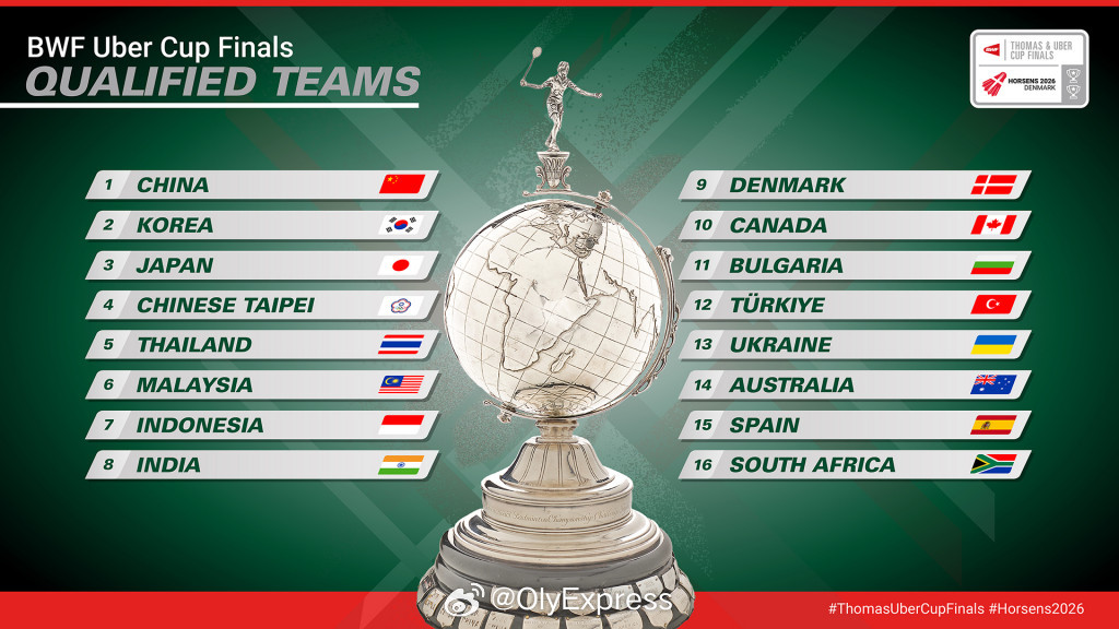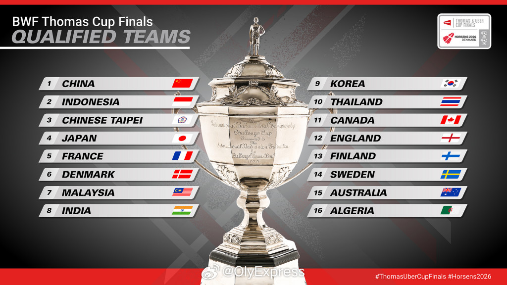 【汤尤杯最终参赛队伍确定】2026年汤尤杯2026年瑞士羽毛球公开赛 3月13日,世界羽联公布了参加今年汤尤杯的最终参赛队伍名单。此前,德国男队和法国女队退出,芬兰男队和西班牙女队递补参赛。比赛将于4月24-5月3日在丹麦霍森斯举行。参赛队伍如下(按种子排序):汤姆斯杯:中国、印尼、中国台北、日本、法国、丹麦、马来西亚、印度、韩国、泰国、加拿大、英格兰、芬兰、瑞典、澳大利亚、阿尔及利亚尤伯杯:中国、韩国、日本、中国台北、泰国、马来西亚、印尼、印度、丹麦、加拿大、保加利亚、土耳其、乌克兰、澳大利亚、西班牙、南非