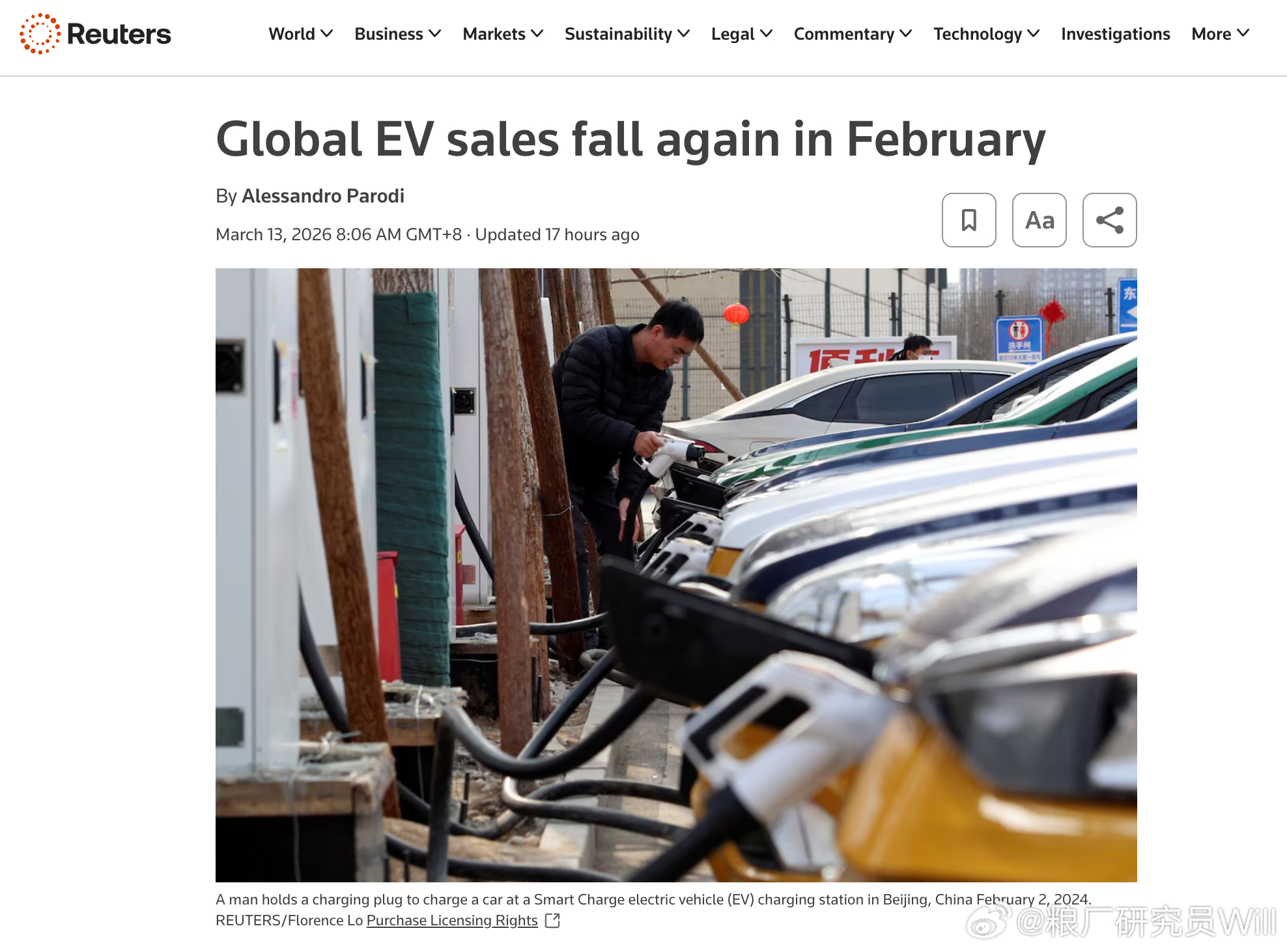 路透社于2026年3月13日报道,2026年2月全球电动车销量再度下滑,连续第二个月同比走弱。中国和北美市场的需求疲软,抵消了欧洲的持续增长。