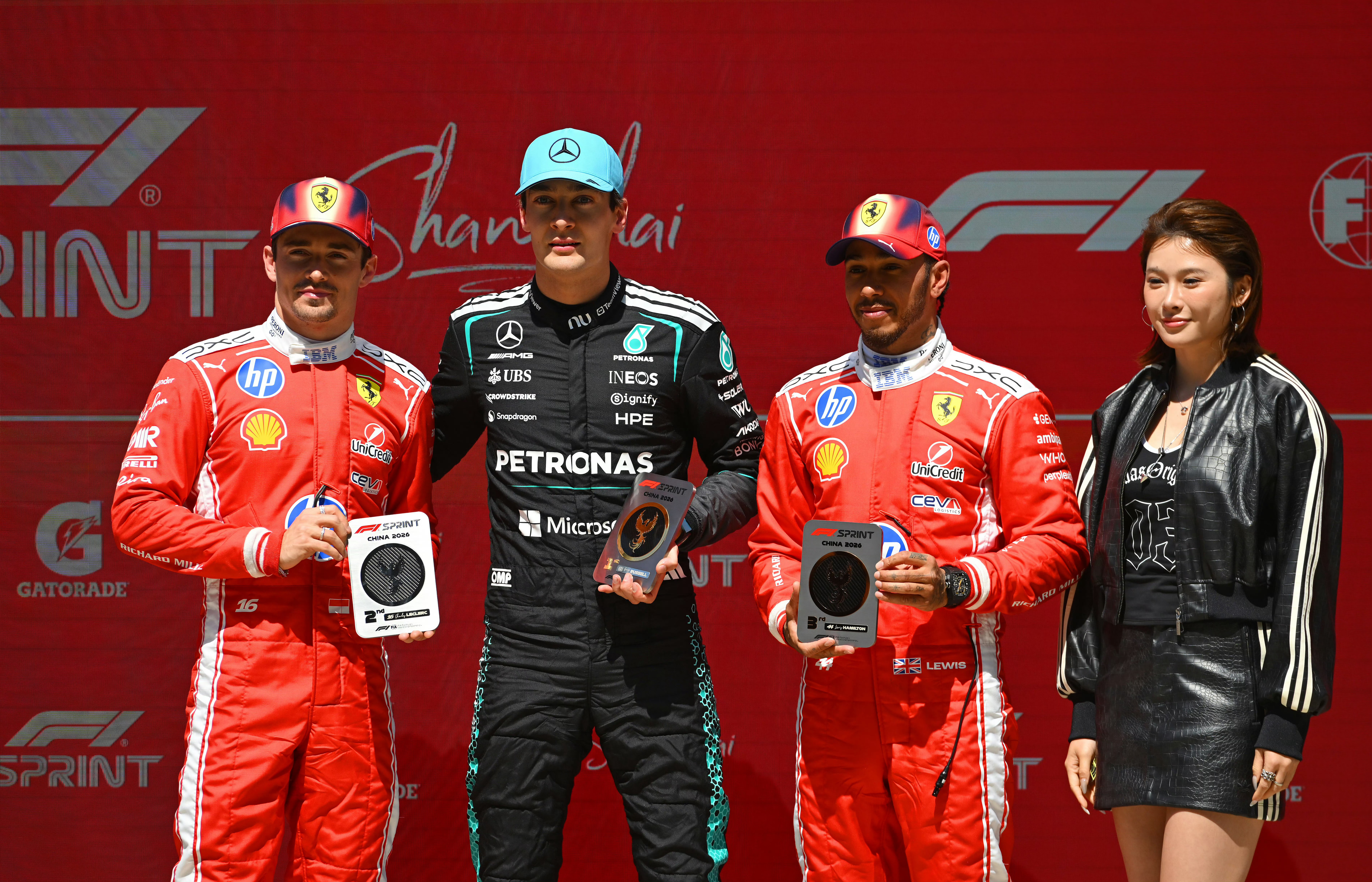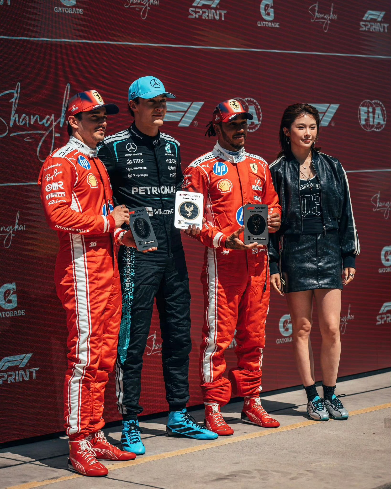 哇哦!田径名将吴艳妮跨界亮相2026年F1中国大奖赛!并为冲刺赛前三名车手拉塞尔、勒克莱尔、汉密尔顿颁奖。