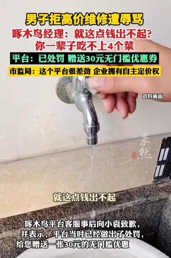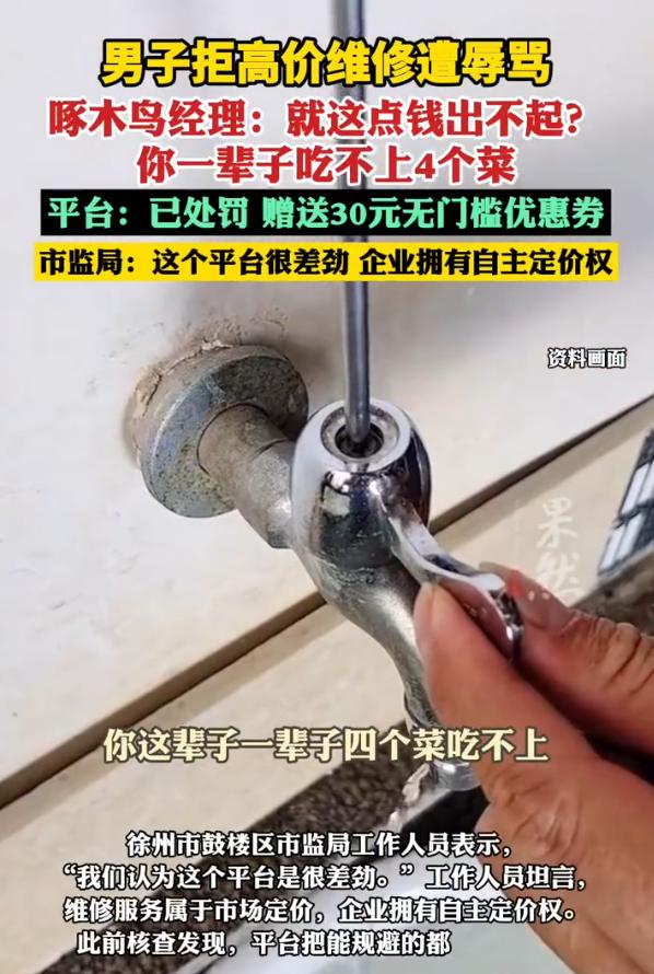 这就过分了!江苏徐州,男子家中水龙头漏水,自己买好材料后就在啄木鸟平台叫了个师傅上门维修,对方报价220元,男子觉得不划算就拒绝了,没成想,对方经理却说他“一辈子吃不上四个菜”,男子这下彻底怒了 小袁介绍,当天家里厨房的水龙头漏水,自行购买材料后,就下单找了个师傅上门,想着东西自己都备好了,那师傅最多也就收个百八十块钱,结果师傅直接报价250块 小袁自然是无法接受,随后师傅又优惠了30元,报价220元,小袁依然无法接受,最后只能拒绝维修,让师傅离开 本以为这个事就过去了,可师傅走了没两分钟又回来,这次还把电话递过来让他接,小袁迷迷糊糊就接过来电话,对方是平台的经理,打电话来不是道歉,也不是说优惠,而是单纯的侮辱他,说一些没钱点什么上门维修,吃不上四个菜一类的话 事后,小袁越想越气,把这个事投诉到市场监管部门,就连工作人员都表示“我们认为这个平台很差劲”,但维修服务属于市场定价,没办法 说实话,这样的事情,让谁遇到了说不生气那都是假的 师傅上门干活,报价高,顶多是“贪”。但这个经理的行为,性质就变了。小袁已经拒绝了服务,这笔交易已经终止。作为平台的管理者,不反思为什么自家报价把客户吓跑,反而打电话对潜在客户进行人格侮辱 而对消费者来说,修个水龙头差点被气得够呛,这代价太大了