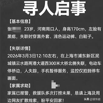 在上海失联的23岁男子找到了!他的遗体在水中被打捞上来,悲剧发生前,他才刚在上海找到了工作,可没想到,就在去厂里报到的那天他就做了傻事! 这个男子名叫张涛涛,他是河南周口人,出生于2003年,今年满打满算才23岁。 过完年后,张涛涛独自乘车从老家赶往上海,事实上,在这个繁华的大都市里,他并不是举目无亲,因为他的姐夫就在上海。 张涛涛很勤快,到达上海的第二天就自己找好了工作。本以为一切都会按部就班的进行,没想到却事与愿违! 2026年3月3日,是张涛涛前往工厂集合报到的日子,可当天中午他就失联了。 根据相关监控记录显示,张涛涛人生之中最后的轨迹如下: 3月3日上午,张涛涛到达了骑着车子到达了工厂大门口。但令人疑惑的是,他只在大门口抽了一支烟就离开了。 中午12点多,他把电动车停在了浦东新区云水路两港大道的路边上,随后,人就不知踪影了。 接下来,他再也没有出现过,就连手机号码都停止了服务。往后的多天里,搜救人员一直在苦苦寻找他,并在大桥附近先后组织了两次打捞作业。只可惜,仍没有找到张涛涛。 3日13日,有知情人告诉媒体记者: 张涛涛终于被找到了,只可惜,他的生命早已经不在了。 他的遗体在大桥下游的一处水域被找到,经警方调查,该事件已排除了刑事案件。事后,张涛涛的家人也坦诚,其家庭近期遭遇了变故。 张涛涛才23岁啊!这么好的年纪,本该是活力满满的时候。可他,最终却没能想开。 令人更唏嘘的是:悲剧发生前,他没有在亲人面前表现过任何异常,还急急忙忙去找了工作。本以为他很坚强,没想到,连一句话都没有留下! 人的一生,很难一帆风顺,无论是在何种环境下成长,都有各自的烦恼和忧愁。 或许,当下的生活并不容易,但无论如何,只要活着就有希望! 为了家人,和那些爱我们的人,请一定要珍爱生命!要学会接纳自己,认清自己,好好的走完自己的一生! 张涛涛终究是太可惜了,他连死都不怕,又有什么事可畏惧呢?他做出这样的选择,家里的父母、亲人该有多么难受啊?[祈祷][祈祷][祈祷][流泪]