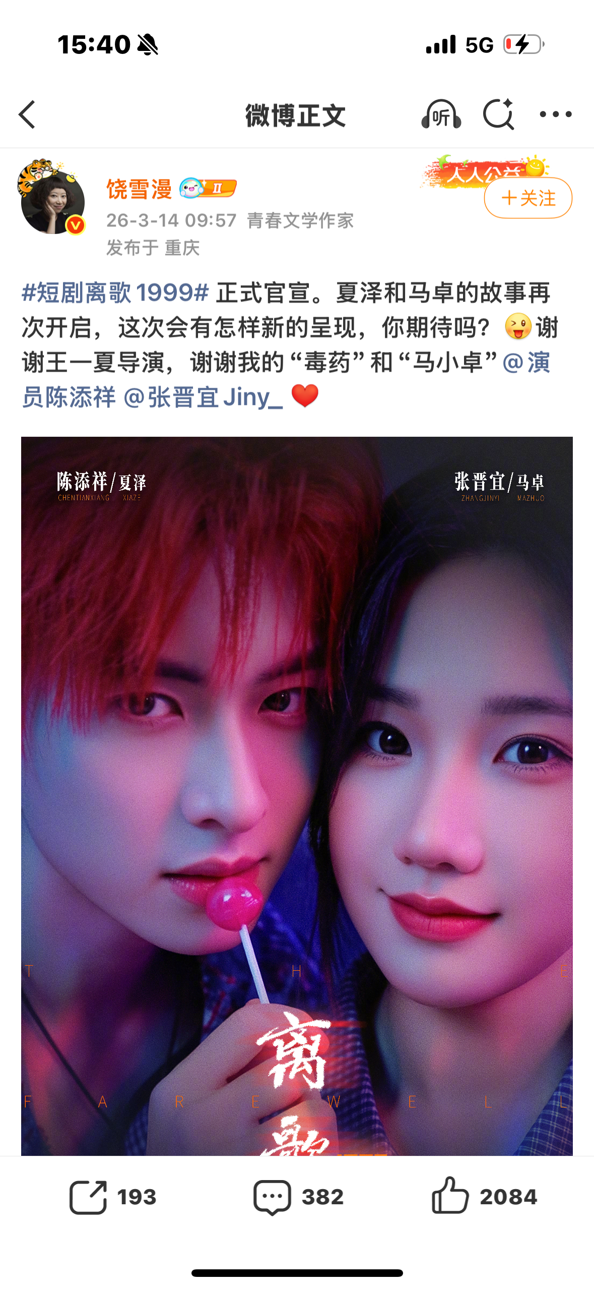 饶雪漫陈添祥合作 饶雪漫发文官宣短剧离歌1999 主演:陈添祥、张晋宜陈添祥张晋