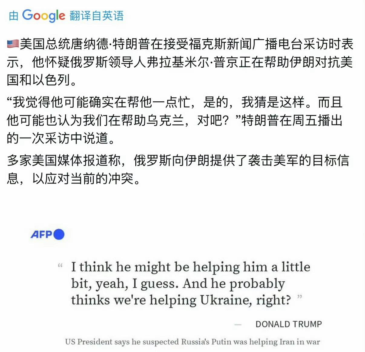 特朗普接受福克斯电话采访表示 “我觉得普京可能确实帮了伊朗对抗美国和以色列”。