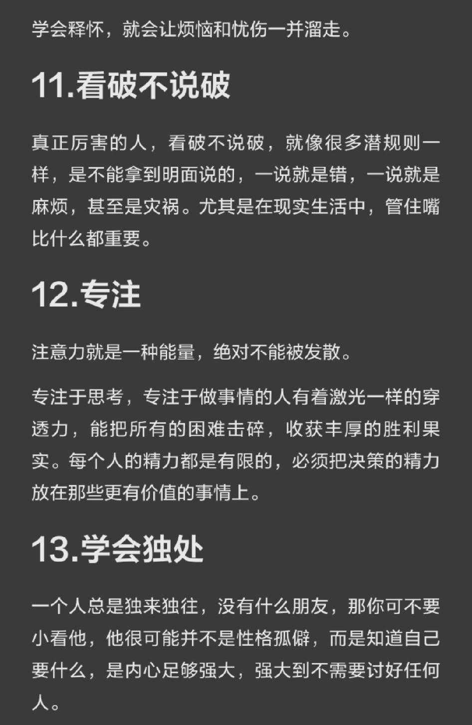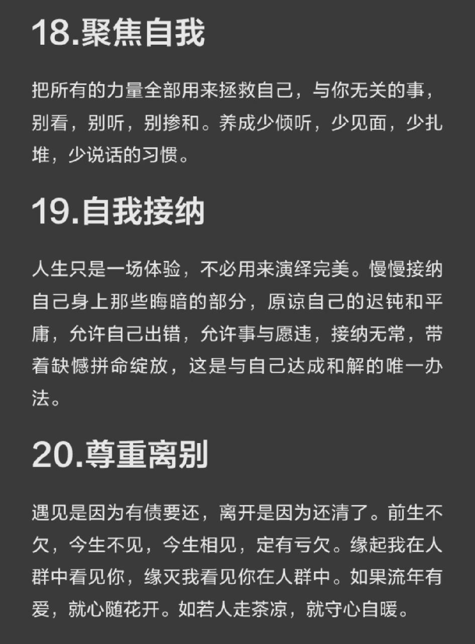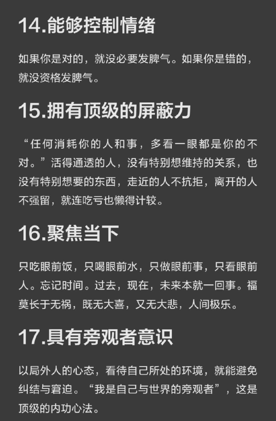体制内修心的最高境界 1.不当真 修心修的就是三个字:不当真。念头不当真,经历不当真,爱恨不当真,甚至修到最后,生死也不当真。不当真就不会执着,不执着自然不会有烦恼,只是扎根于觉知中,允许一切流过当下,体验并观照事物的发生和变化,心不取相,如如不动。 2.允许一切发生 一切的发生,本身你就是不可能去阻挡它的。你害怕也这样,不害怕也这样,所以我选择让它过去,不去再跟它较劲。当你允许一切发生了之后,你就会变成一个比较柔软的人,放松的人。所有的这些不愉快的东西,你把它放在死亡面前你都可以包容,你都可以解释,你就通了,你就不会过得那么拧巴了。 3.情绪不上脸 内心强大的人,心有静气,再大的事也不慌乱,因为他们知道自己能面对它,也有信心解决它;相反,一些内心脆弱的人,生活中发生一点小事就茶不思饭不想,感觉天都要塌下来了,满脸都写着丧。 4.别贪心 你以为错过了的是遗憾,其实可能是躲过了一劫。别贪心,你不可能什么都拥有,也别灰心,你不可能什么都没有。所愿所不愿,不如心甘情愿。所得所不得,不如心安理得。 5.看轻看淡 人生的高度,不是你看清了多少事,而是你看轻了多少事;心灵的宽度,不是你认识了多少人,而是你包容了多少人。 做人如山,望万物,而容万物。做人似水,能进退,而知进退。 人生就是一场修行,修行贵在修心,世事多变,唯有修炼好自己的内心,才能在漫长的岁月里,不纠结、不惊慌、不迷茫。看清不如看轻,看透不如看淡。 6.永远不要问别人原因 记住,人越聪明,话越少,威严就越盛,能量场就越强,金钱就越多。 7.不要凡事都去 追求公平、公正 嘴上喜欢谈公平、公正的人,大概是个穷鬼,原因很简单,他看不到人家祖祖辈辈的努力和能量加持。我们的注意力,应该全部聚焦于获得资源上,你获取的资源越多,你对整个家族的基因都是一种正向的加持。讲大道理,只会让自己的能量越来越亏。 8.永远不抱怨 不去想"为什么是我",而是思考"这件事教会了我什么"。保持这样一种心态:凡事发生,必将有利于我。 9.不害怕伤害 不要害怕失去你所失去的,本来就不属于你。也不要害怕伤害,能伤害你的,都是你的劫数。繁华三干,看淡即是浮云。烦恼无数,想开便是晴天。