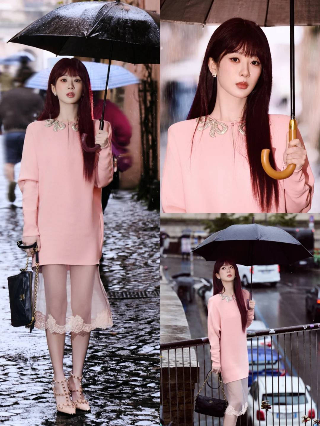 不管是机场出发look的粉红蝴蝶结外套+牛仔裤,还是看秀现场的早秋蝴蝶结连衣裙搭配铆钉高跟鞋,粉色蝴蝶结元素,衬托杨紫高贵少女感十足!G社生图也美我一大跳,真华伦天奴亲公主啊~