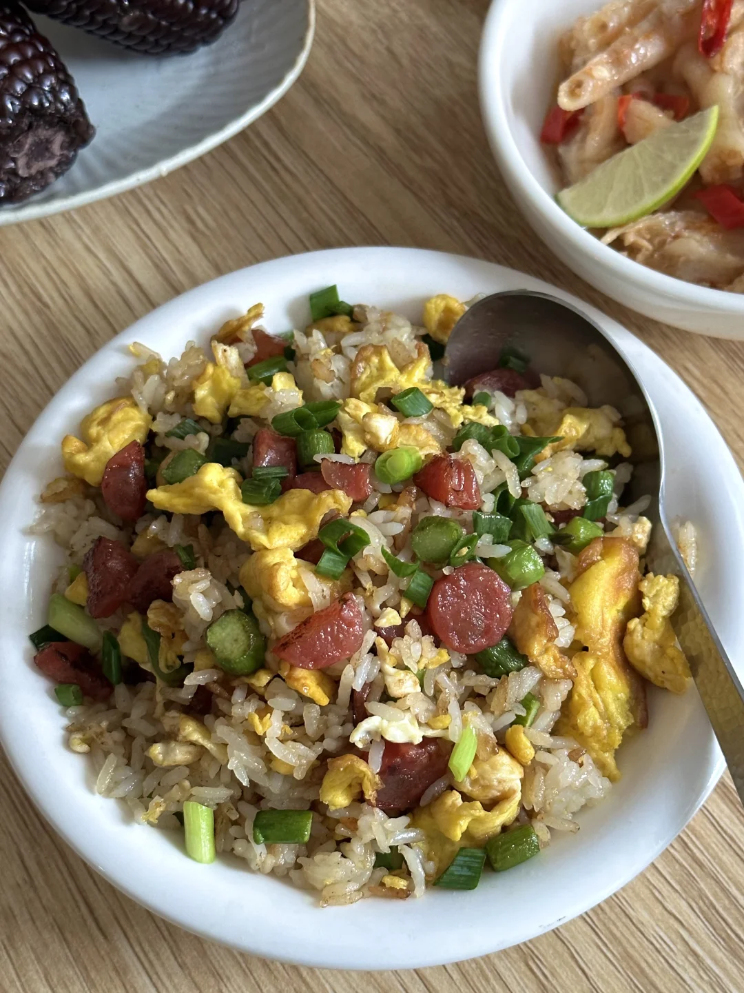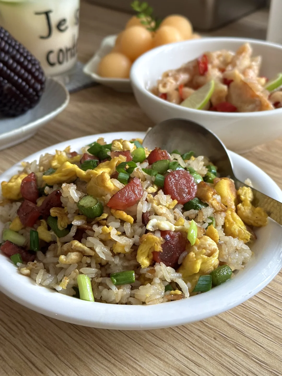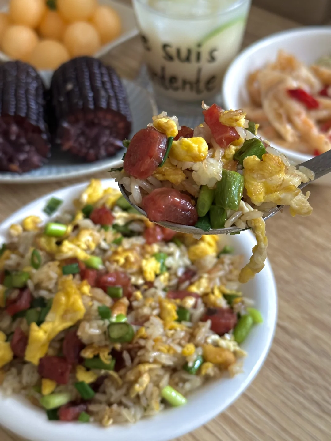 🍲芦笋丁腊肠蛋炒饭 🥗脱骨凤爪 🌽黑糯玉米 🍈哈密瓜 🥛柠檬养乐多