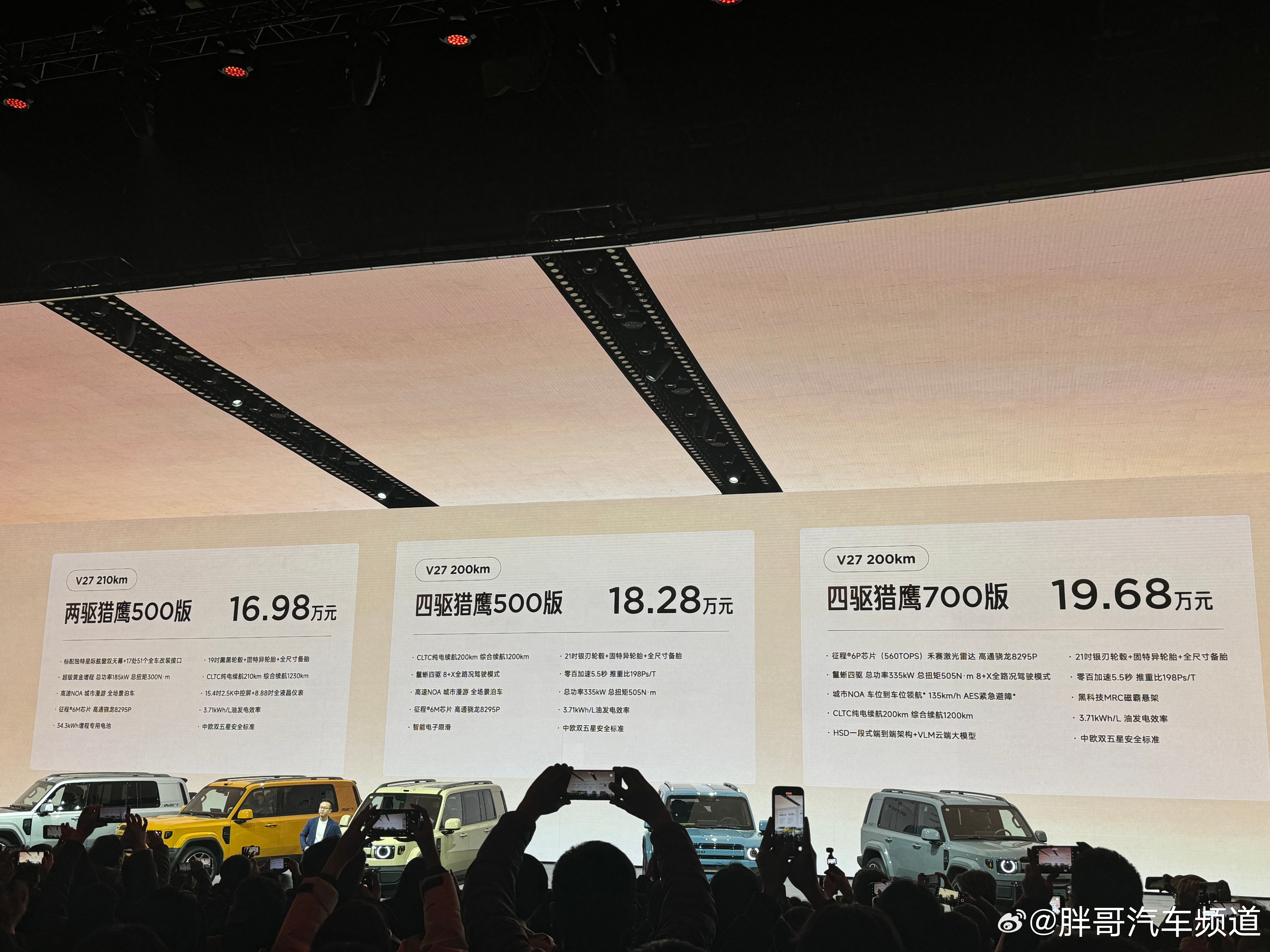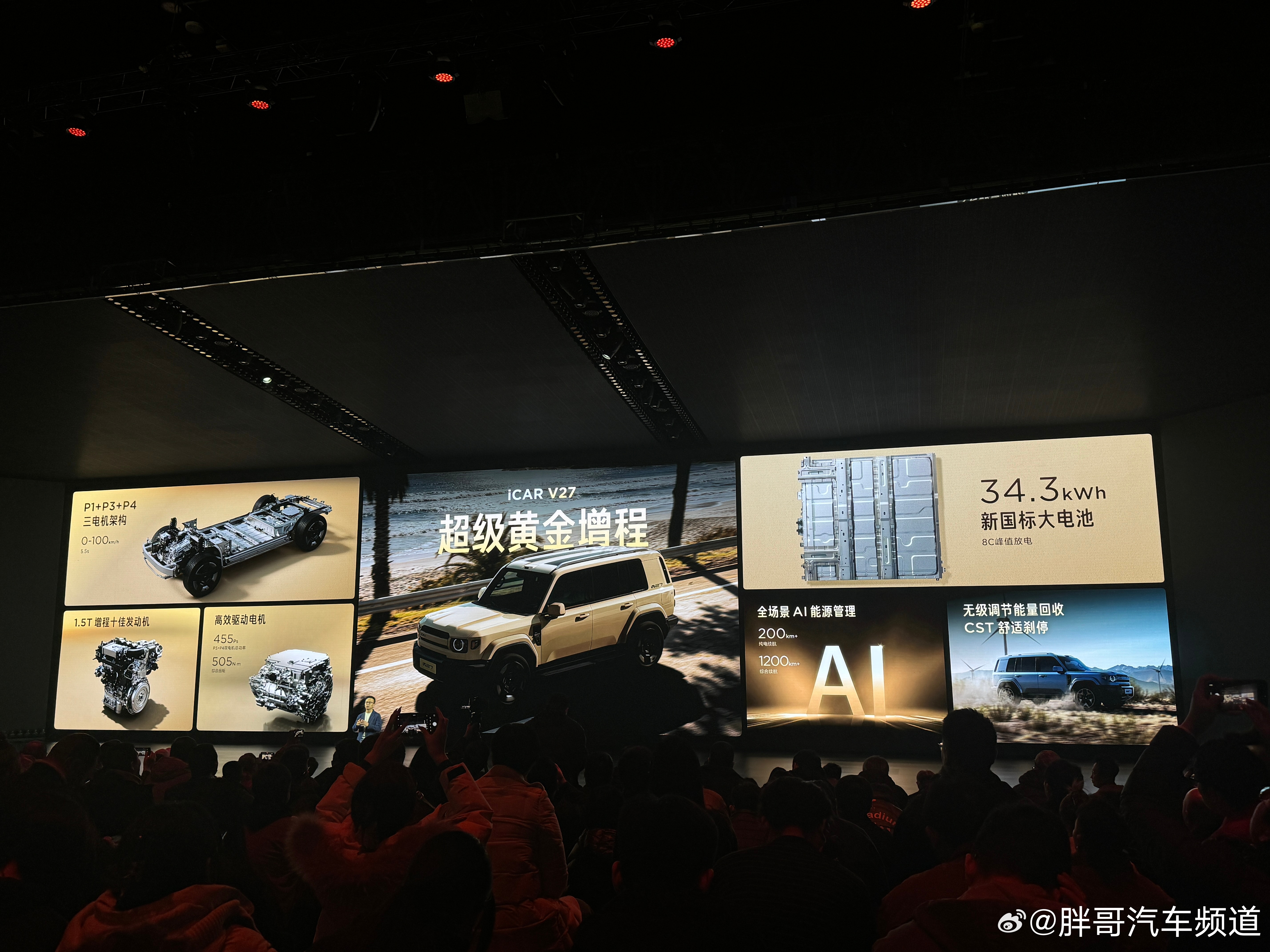 胖哥汽车频道 iCAR V27上市,指导价16.98-19.68万元。新车定位中大型的SUV,采用方正造型,长宽高分别为5055/1976/1894mm,轴距2910mm,提供24.5°接近角/离去角和220mm离地间隙,兼顾城市与轻度越野场景。另外,新车全系标配8295P芯片+30TOPS算力,顶配搭载560TOPS辅助驾驶系统;1.5T增程动力,纯电续航200-210km,综合续航超1200km;首创"星际舷窗"双天幕与生态改装接口(全车17处51个),支持200kg车顶承重和外放电功能。V27全能硬派全家都爱iCARV27全能上市16.98万起
