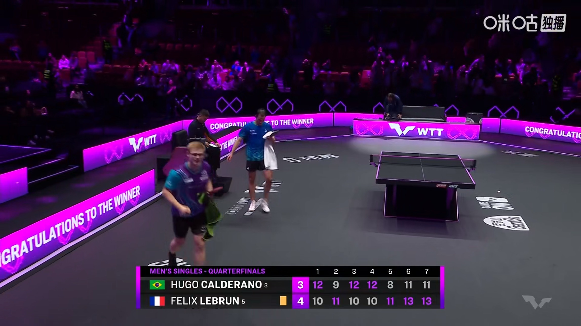 F勒布伦4比3卡尔德拉诺(10-12,11-9,10-12,10-12,11-8,13-11,13-11)晋级wtt重庆冠军赛2026 男单四强