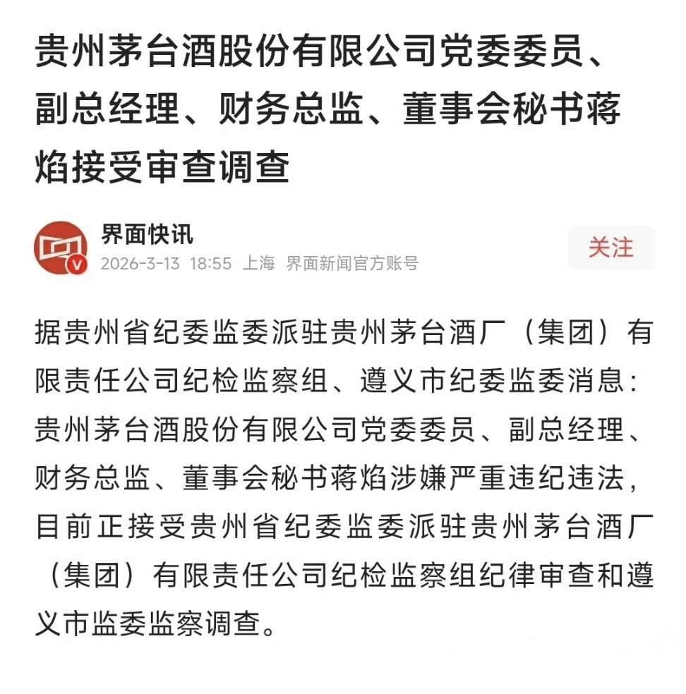 茅台美女高管蒋焰落马被查!万亿“钱袋子”也守不住了? 茅台这个瓜可够大的,毕竟是手握财务大权的蒋焰,从副总、财务总监到董秘,一身兼三职,妥妥的茅台“钱袋子”+“发言人”,结果直接被纪委监委带走调查,涉嫌严重违纪违法。 大家想想,一个人管着万亿茅台的钱、账、对外说话的嘴,这权力有多大?以前大家总说茅台是“股王”,是最稳的价值投资,可现在看看,三任董事长接连落马,十几个高管前赴后继被查,从卖酒的到管钱的,腐败链条一环扣一环,这哪是企业,简直是“反腐连续剧”现场! 蒋焰这事儿更扎心:一边是光鲜亮丽的职业女性形象,出席各种高端论坛,对着镜头侃侃而谈合规风控;一边是背地里可能藏着的利益输送、暗箱操作,把国有资产当自家提款机。老百姓最恨这种“两面人”,台上讲廉洁,台下搞腐败,把我们对国企的信任踩在脚下。 茅台每次都嘴硬说“生产经营正常”,可高管接二连三被查,谁还敢信你的财报?谁还敢买你的股票?这不是简单的个人问题,是权力监督的大窟窿——当一个人能同时管钱、管账、管信息披露,就等于给腐败开了绿灯,不出事才怪! 看来啊,再大的权力,再光鲜的履历,只要敢伸手,早晚要翻车! 茅台 蒋焰被查