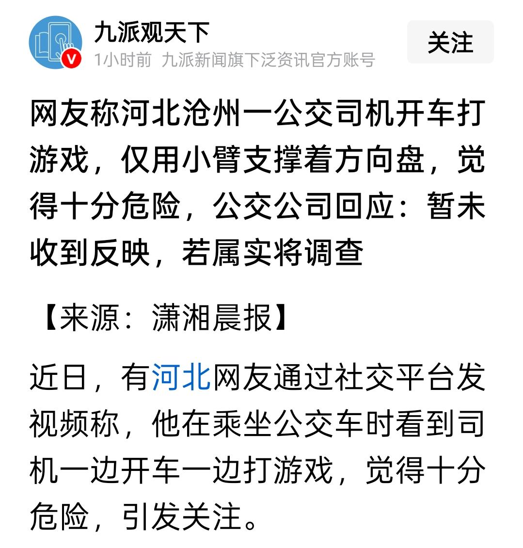 太吓人了!沧州一公交司机被曝开车打游戏,方向盘只用小臂控制,乘客心惊胆战! 近日有网友发视频爆料,在河北沧州乘坐公交车时,发现司机竟然一边开车一边低头看手机打游戏! 视频里能看的清清楚楚,这位公交司机双手都没正经扶方向盘,而是用小臂支撑着凑合开。 这要是遇到突发情况,根本来不及反应!网友说当时觉得特别危险,拍下视频就是想提醒一下。 公交车上那么多人,老人小孩都有,这哪是开车啊,简直是在玩命!是在拿一车人的生命开玩笑。 对此公交公司回应说,目前还没收到相关反映,但如果情况属实会进行调查处理。 说实话这种回应有点敷衍了,难道非要等出事了才重视吗? 开车打游戏这种行为既不符合职业规范,也太不负责任了,这简直就是在违法犯罪。 希望公交公司能认真查清楚,给乘客一个交代。同时也提醒大家,乘车遇到这种情况一定要及时举报!