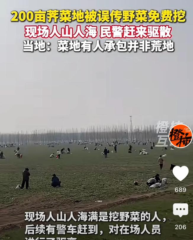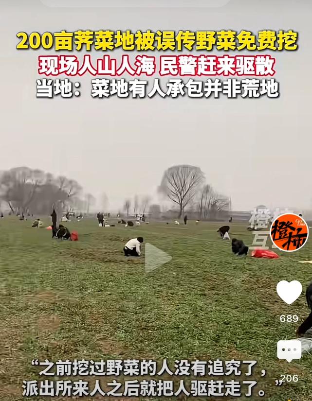 损失谁来赔?河北,一男子承包200亩地种荠菜,谁知被他人发帖称“可以免费挖野菜”,结果引来很多人挖荠菜,报警后,民警对挖野菜的人进行驱赶,网友:这种事年年发生!   最近刷到个事儿,越看越让人揪心,不少网友都在讨论,河北邯郸那边传着说有免费野菜挖,结果一群人蜂拥而去,最后才知道,那根本不是没人管的野生荒地,是人家农户大哥承包的200亩荠菜地,这一下,大哥大半年的辛苦全打了水漂。   据了解,这片荠菜地一开始定位显示在河北邯郸张二庄镇北善村,就在卫河大堤旁边,后来才弄清楚,实际是在卫河对岸,属于河南内黄县马上乡管,就是因为定位出了点问题,才被大家误以为是河北的地。   承包这块地的农户大哥,本来是瞅准了商机,想靠着这200亩荠菜赚点钱,没成想,年前因为管理上的疏忽,荠菜没及时采摘售出,就被别有用心的人钻了空子。   不知道是谁,在网上发了条消息,说这片地里的野菜是野生的,大家可以免费随便挖,就这么一句话,一传十十传百,周边不少人都动了心,拿着铲子编织袋,有的甚至开着私家车赶过来,地里很快就挤满了人。   大家低着头一个劲地挖,有的连荠菜根都拔了,场面乱得不行,农户大哥发现的时候,地里已经被挖得乱七八糟,看着自己辛苦种的荠菜被人肆意采摘,急得直跺脚,没办法,只能赶紧报警。   民警赶到现场后,就对正在挖野菜的人进行了驱赶,可这时候说啥都晚了,大部分荠菜已经被挖光,地里到处都是被踩坏的菜苗和土坑,有挖过野菜的网友说,后来现场有人看守,但地里基本上没什么东西了,都被挖得差不多了。   最让人头疼的是,这些挖野菜的人,大多是看到网上的不实消息才来的,他们觉得自己只是跟着凑个热闹,挖点尝尝鲜,不算啥大事。   可这块地是农户合法承包的,地里的荠菜不管是不是及时收割,都是人家的私人财产,没经过主人同意就随便挖,本身就是侵权,现在大家最关心的,就是这损失到底该谁来赔。   目前能确定的是,发布不实信息的人叫侯某某,警方已经表示会依法处理他,他作为始作俑者,肯定要承担主要的赔偿责任,毕竟是他的谎言直接导致了农户的损失。   而那些挖过野菜的人,也不是完全没责任,只要动手挖了,就侵害了农户的财产权,理论上也得承担相应的赔偿,别想着“法不责众”就能置身事外。   其实看网友评论就知道,这种事年年都有,有人贪小便宜,看到“免费”两个字就失去理智,也不核实信息真假,跟风去抢,最后受伤的都是辛苦种地的农户。   农户大哥承包200亩地,投入了时间和成本,本来想着能有个好收成,结果因为一句不实言论,损失惨重,换谁都得心疼。   希望这次的事能给大家提个醒,网上的消息别随便信,遇到“免费挖野菜”“免费摘水果”之类的说法,多留个心眼,核实一下真假。   也希望相关部门能加大对造谣者的处罚力度,让那些不负责任的人付出代价,别再让辛苦种地的农户,为别人的错误买单。