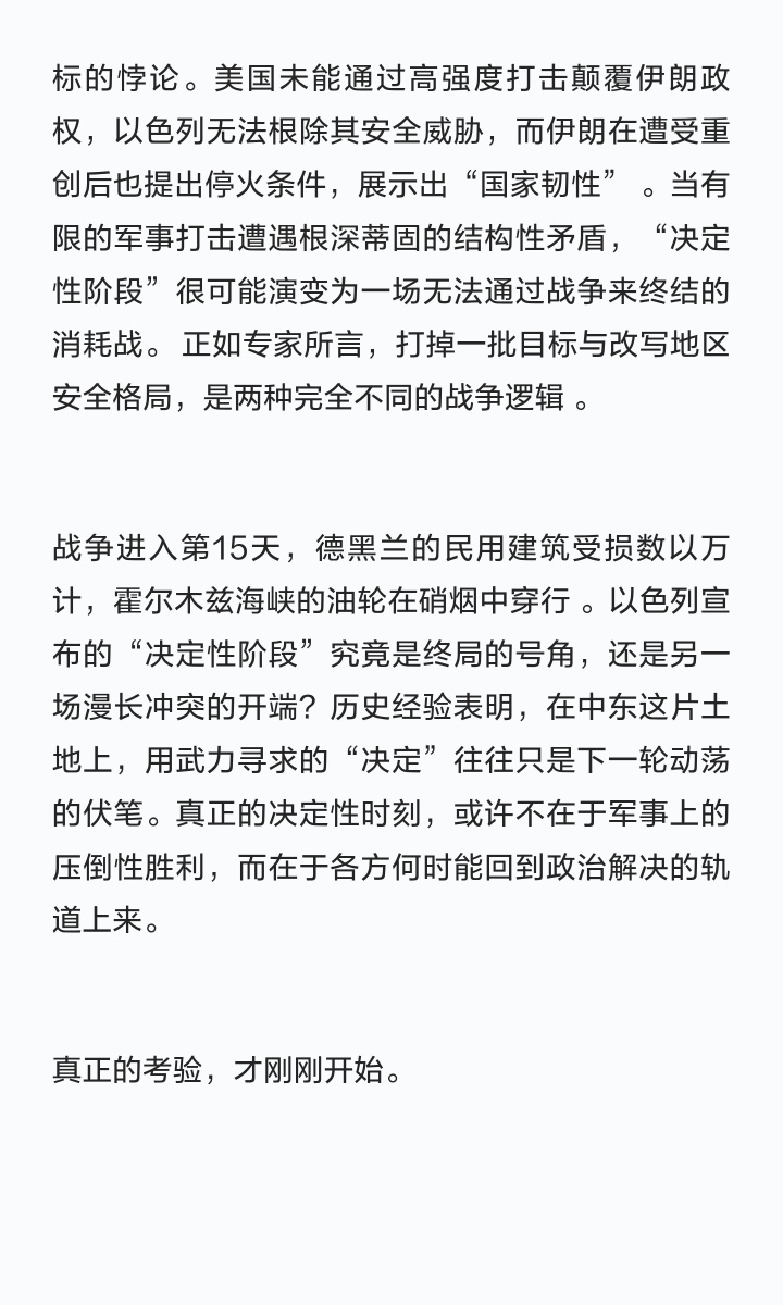 战争进入第15天,德黑兰的民用建筑受损数以万计,霍尔木兹海峡的油轮在硝烟中穿行 。以色列宣布的“决定性阶段”究竟是终局的号角,还是另一场漫长冲突的开端?历史经验表明,在中东这片土地上,用武力寻求的“决定”往往只是下一轮动荡的伏笔。真正的决定性时刻,或许不在于军事上的压倒性胜利,而在于各方何时能回到政治解决的轨道上来。