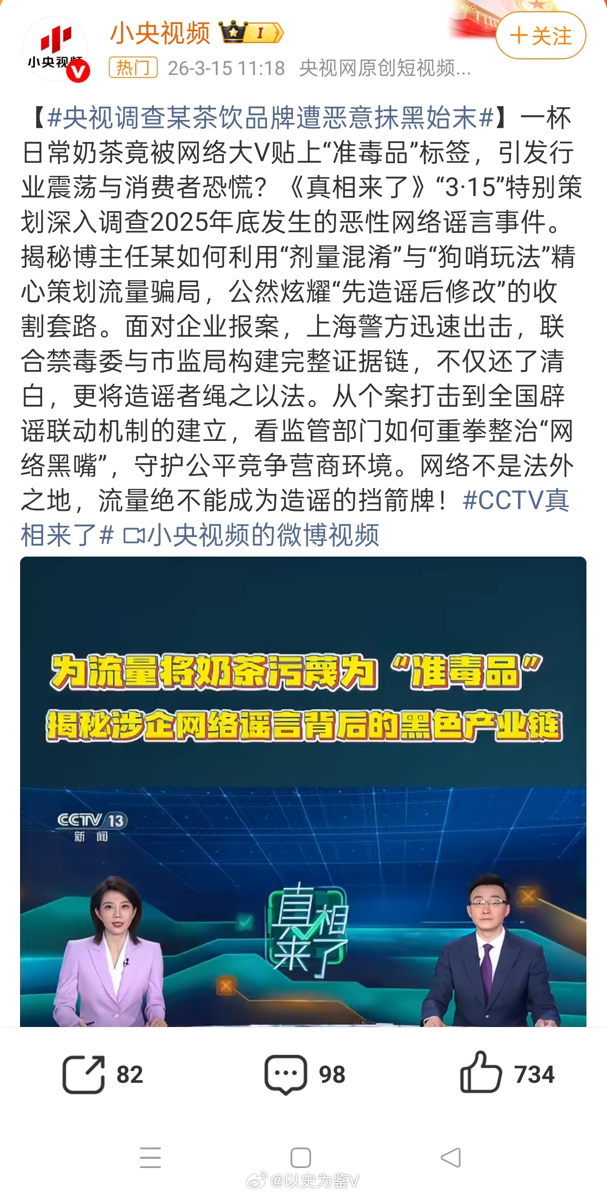 央视调查某茶饮品牌遭恶意抹黑始末央视315都开始调查准毒品的事情了马逆:这下真骗到廷杖了!