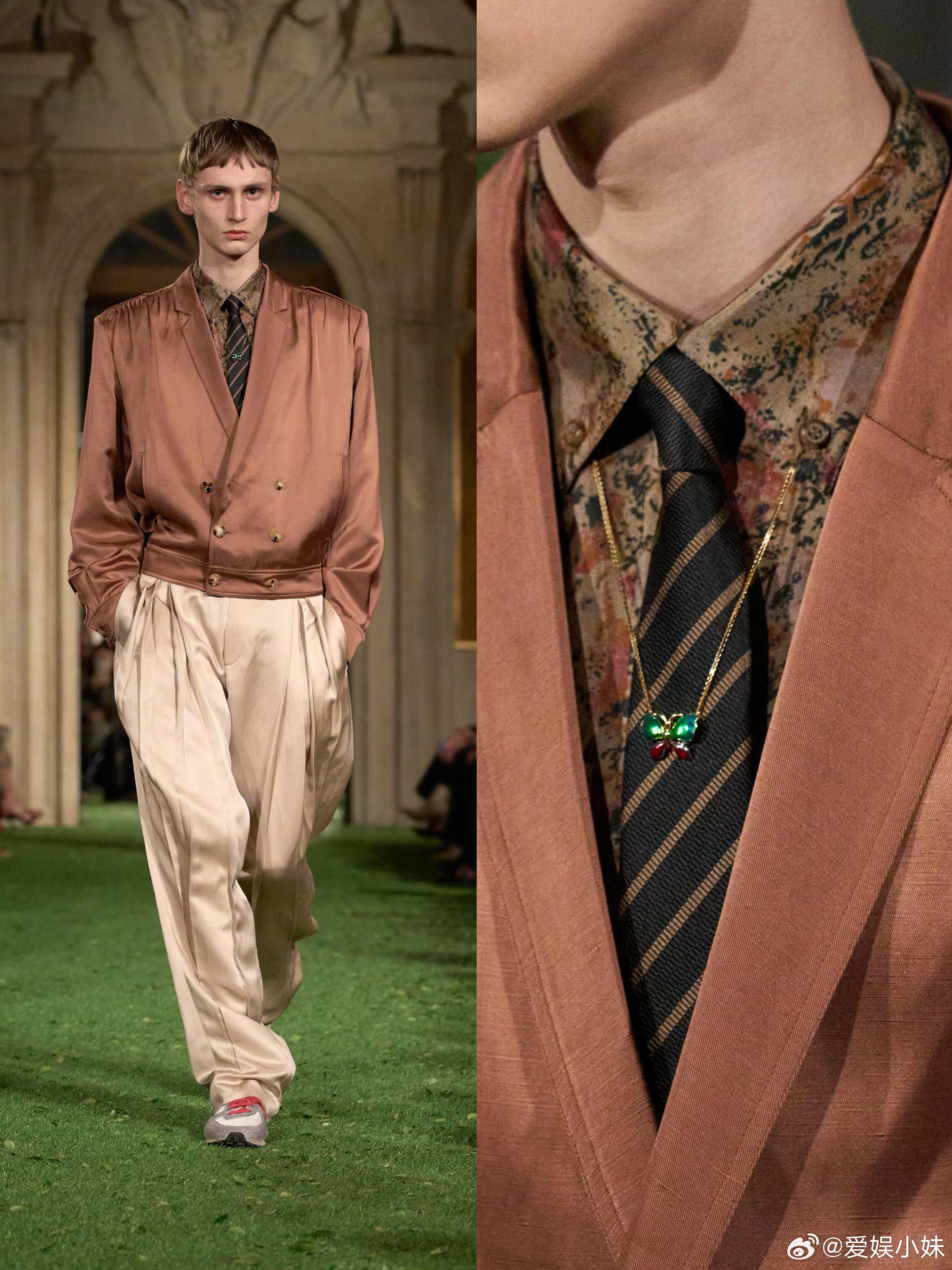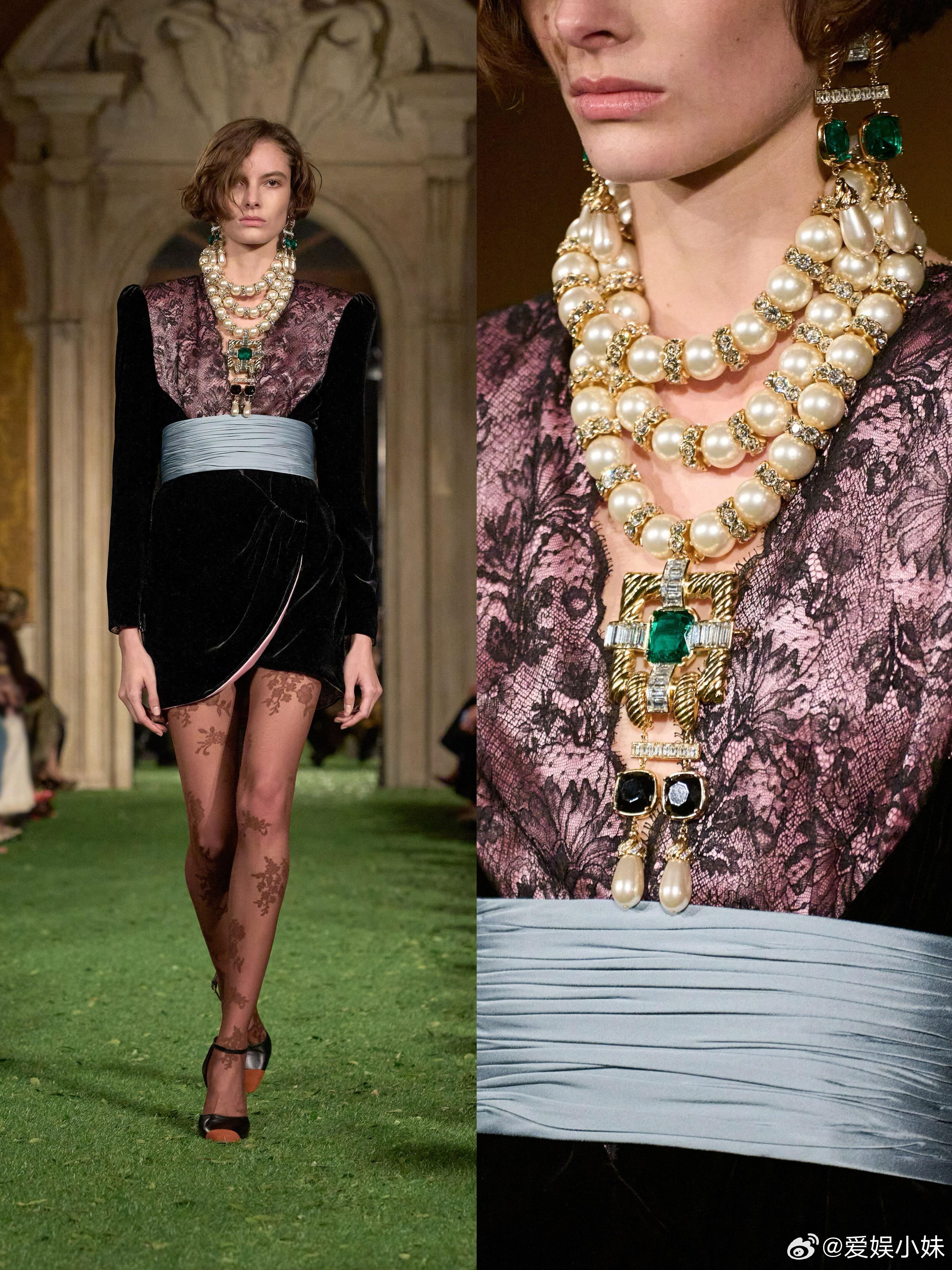 配饰与装饰符号是这一季的点睛之笔。蝴蝶形金属件在腰带、包袋和服装装饰部位反复出现,成为系列内部的视觉标记,为整体造型增添精致感。Rockstud 铆钉鞋、夸张珠宝和蕾丝滚边持续登场,金属件的硬度、珠宝的装饰密度与铆钉元素,和礼服、蕾丝形成鲜明对比,丰富了造型的层次感。