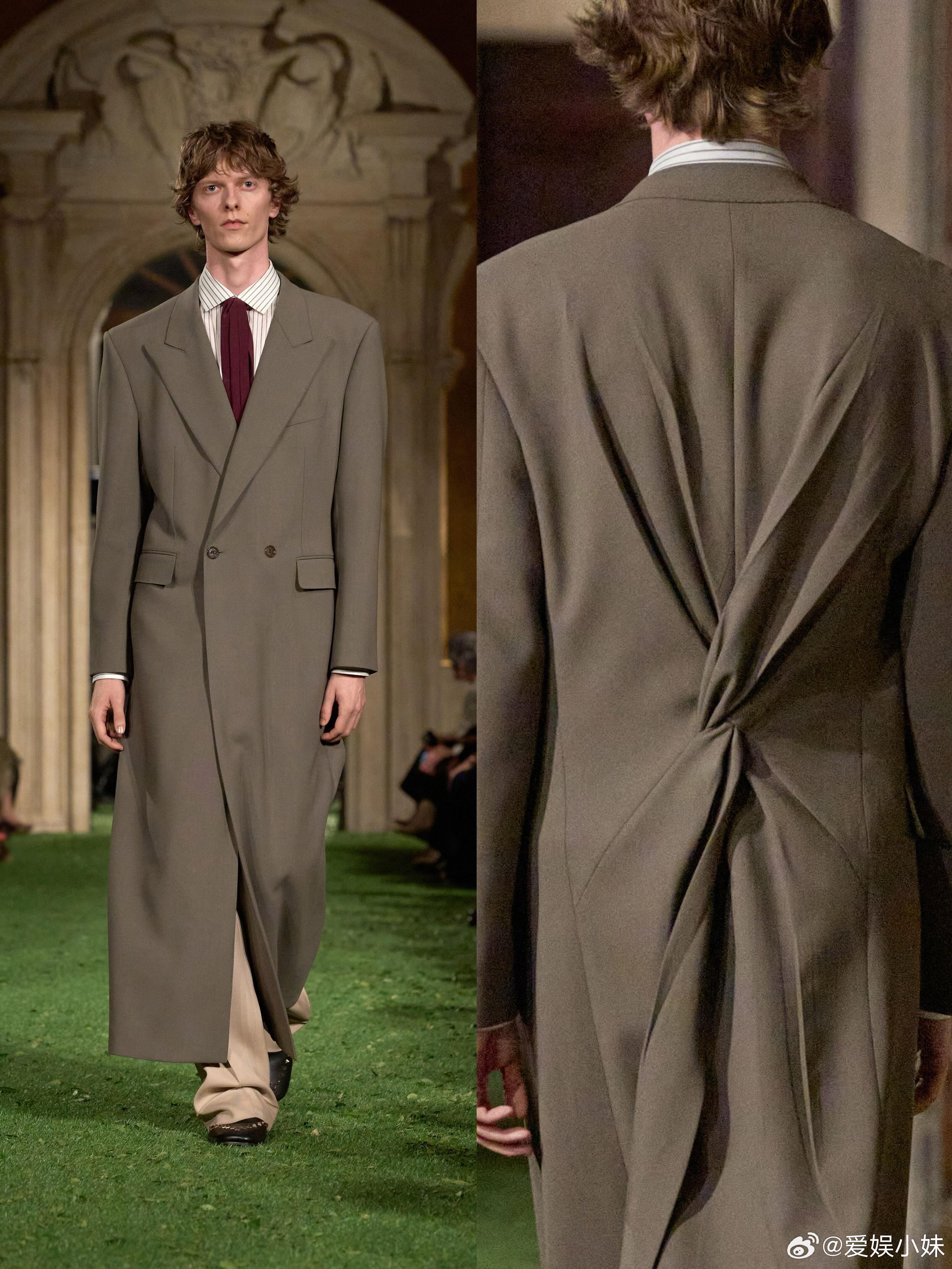 这一季,面料成为造型体量的关键塑造者。塔夫绸礼服以挺括的体积结构展现庄重,蕾丝边缘的柔软装饰增添柔美,亮片外套的图案表面闪耀夺目,皮革外套的硬度则带来硬朗质感,不同材质相互碰撞,奏响时尚的和弦。褶裥作为重要结构语言,在多件裙装与外套上大放异彩。腰部或臀部的扭转与聚拢,形成雕塑式堆叠,让衣服表面充满张力,仿佛每一道褶裥都在诉说着时尚的故事。
