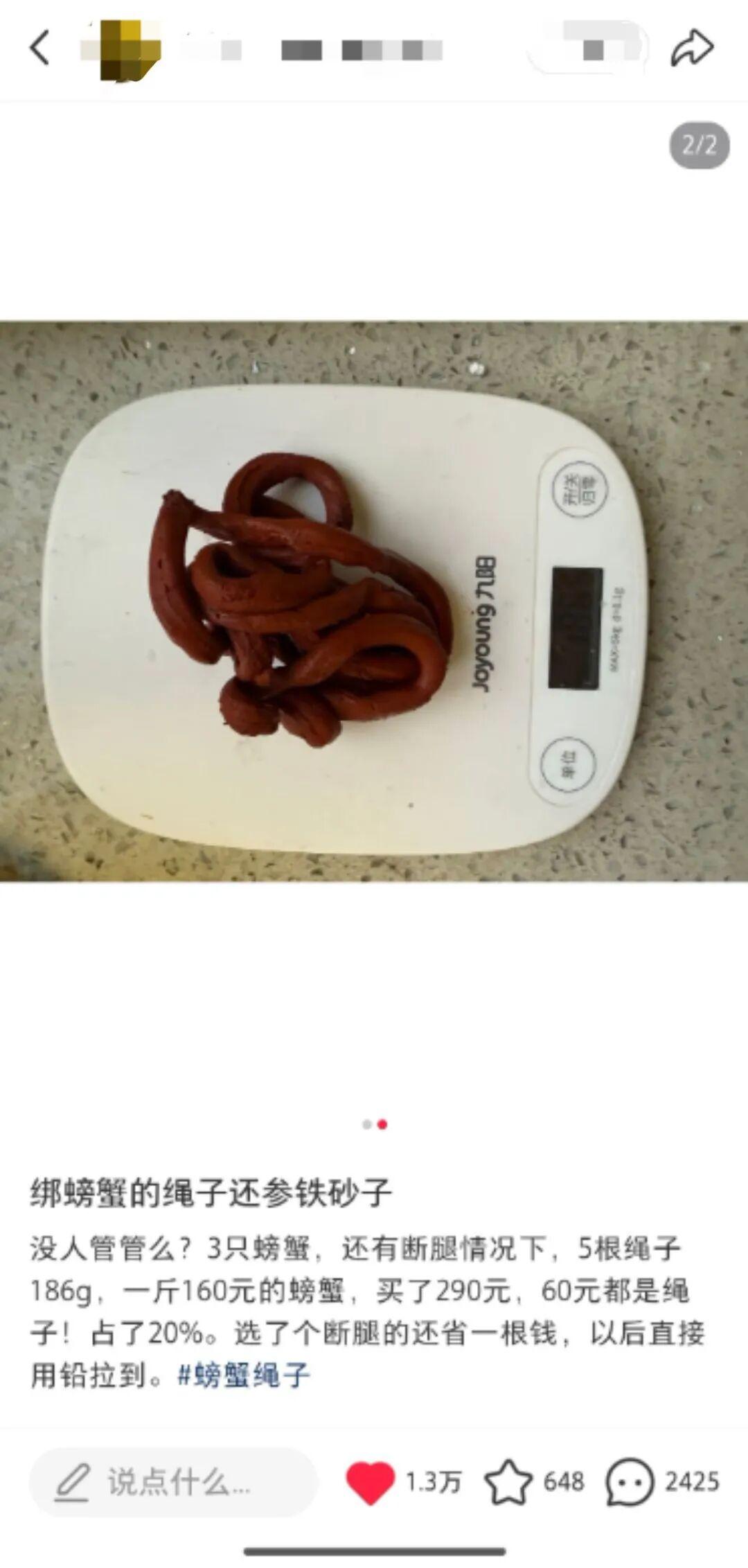 太不地道了!福建福州,女子在菜市场花290块钱买了三只螃蟹,称重时显示是1.8斤,可等她到家却发现,绑螃蟹的绳子不太对劲,剪开一看发现塑胶绳里掺“铁砂”,而这个绳子就花了她59块钱 元宵节那天,黄女士想在菜市场买点好的。经过一家水产店时,瞅见了标价160元一斤的螃蟹,看着挺肥美,就挑了3只。过秤显示,螃蟹加绳子一共1.81斤,刚好290块钱 按理说,这个价位的螃蟹,怎么着也得是硬菜了。可等她回家清洗时,觉得手里这绑螃蟹的塑胶绳沉甸甸的,手感不太对劲 一开始她还以为绳子吸水,结果找来剪刀剪开一看,好家伙,绳子里头密密麻麻塞满了细小的颗粒,用吸铁石一试,果然能吸住,这就是掺了铁砂啊! 黄女士也是个较真的人,拿出自家的克重秤一称,这5根绳子加起来足足有0.37斤。按160元一斤算,这根绳子就让她掏了将近60块钱,占了总价的两成。她自己也哭笑不得,说这还是因为有一只螃蟹断了钳子,少绑了一根绳,不然亏得更多 这事儿曝光后,有记者专门去那个市场探了探底。结果发现,这根本不是个例。记者随便买了两只螃蟹做实验,其中一只连绳总重0.74斤,光绳子就占了0.32斤;另一只更离谱,总重0.69斤,绳子占了0.32斤,螃蟹只剩0.37斤。绳子跟螃蟹几乎一样重,你敢信? 有卖了20多年海鲜的商户倒苦水,说这绳子不是他们绑的,是从马尾那边的批发市场进货时就有的。每年从春节前到正月后,这种“加重版”的绳子就出来了。商户还说,要是没这粗绳子绑着,螃蟹得卖到200块一斤,现在绑了绳只卖130、160,让顾客自己掂量 这话听起来,好像是在为消费者着想?可仔细一品,味儿不对。这就像什么呢?就像你去买苹果,商家说,这箱子虽然重,但箱子里的苹果便宜啊。问题是,我是来买苹果的,不是来买箱子的 不是说不能绑绳子,也不是说非得用轻如鸿毛的绳,但得让消费者买得明白。你可以在绳子上赚钱,但不能在秤上骗人 你把绳子的重量单独标出来,让大家知道这一斤里有多少是螃蟹、多少是绳子,买不买是人家的事。而不是像现在这样,让人稀里糊涂地花高价买回一堆铁砂 黄女士有句话说得很在理:你可以涨价,翻倍都行,但我不喜欢这种坑蒙拐骗 这大概是每个消费者心里最朴素的想法。靠小聪明、玩障眼法能赚到的钱,终究是短暂的。一根掺了铁砂的绳子,也许能让你多赚几十块,但失去的,是顾客对这个摊贩、对这个市场的信任