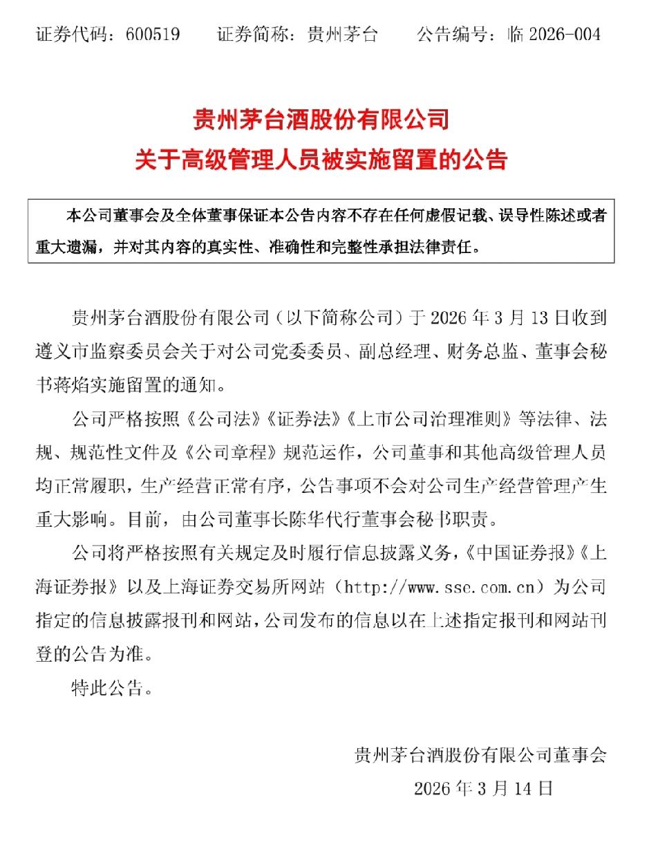 贵州茅台酒股份有限公司公司发布公告:2026年3月13日收到遵义市监察委员会,关于对公司党委委员、副总经理、财务总监、董事会秘书蒋焰实施留置的通知。 据蒋焰的履历看,大学毕业先是进了银行,从事会计工作,然后就进了茅台酒股份有限公司,从会计开始做,一直做到国企大公司副总这个位置,升迁速度十分惊人,网络上各种说法都有,这个茅台酒有限公司副总,属于高管了,年薪是很高的,可能还有股份吧?这么年轻做到这个位置不容易,也不知道具体是因为什么被查的?