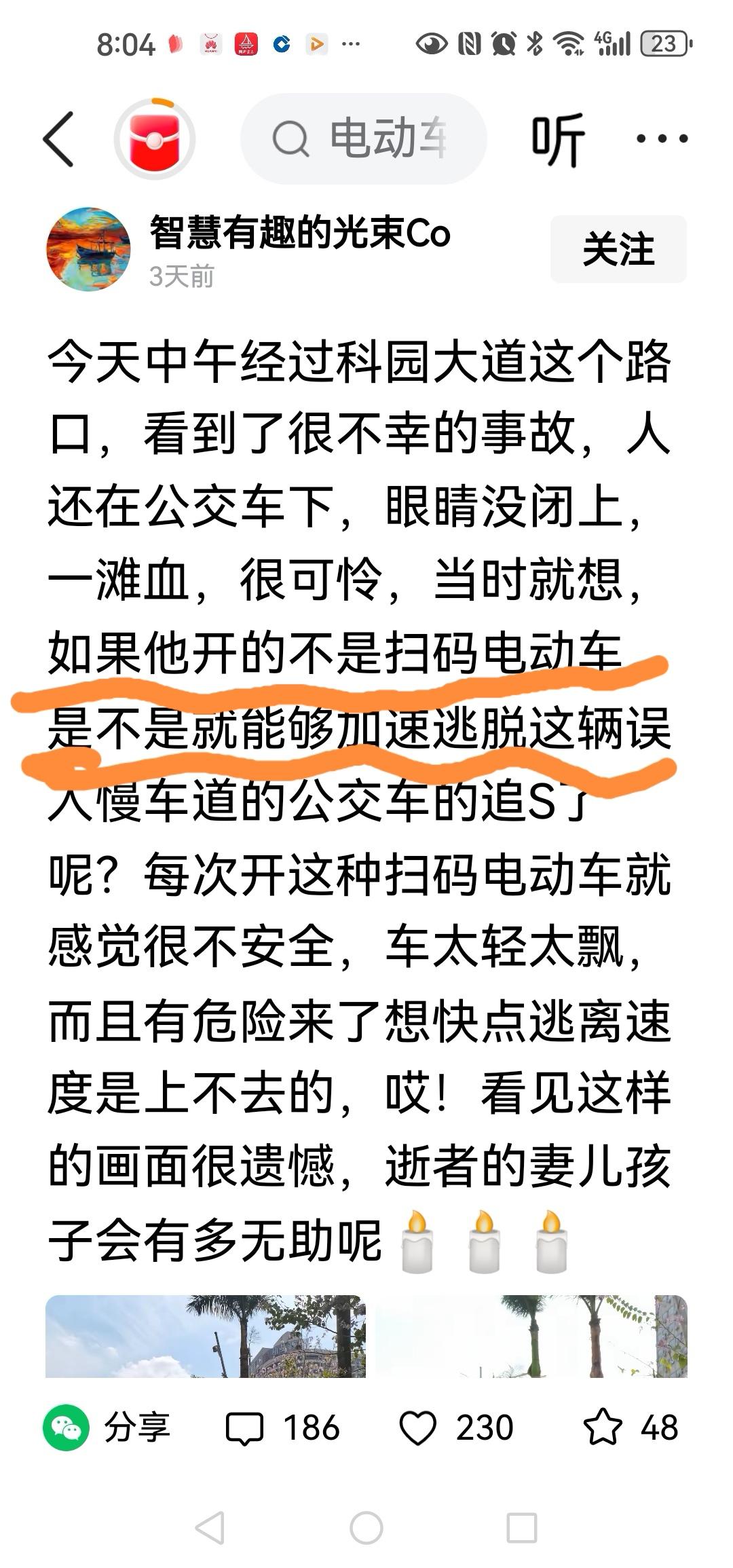 事故发生的原因是什么不太清楚,但这句话有一定道理。 “如果开的不是扫码电动车,是不是就能够加速逃脱” 也终于遇见有个这种想法的人了,一直觉得共享车,新国标车限速25公里,其实是一种非常危险的限速,因为在有特殊的紧急的情况下,你想加速,瞬间加速逃离,或想或不得不超越前面车辆时,你却根本提不起速度,这很容易被撞倒。 新国标电动车设定25公里每小时,是出于安全考量,但实际上它事故的风险也是在增大的。