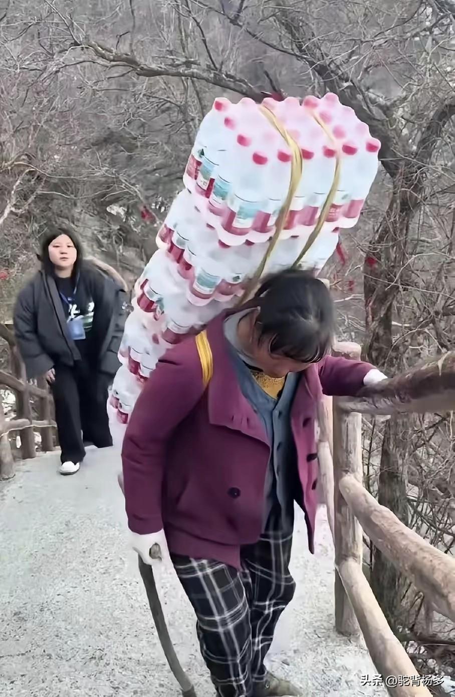 敬佩大姐!大姐背六件纯静水上山,超过60斤重的水压着大姐的背,她一手扶着上山扶手,一手拄着拐棍艰难而行,当她停下来休息的时候,她的脸上露出了疲惫、艰辛。 普通人身无重物爬山都艰难,还需要一个登山杖,那大姐为何要背这么重的水爬山,她不累吗? 一家有一家的难,各人有各人的不容易。大姐背的是水,实际上是为养活她的家人而努力。 普通人的生活都不容易,父母的背扛起了家庭的重担,希望子女能体谅父母的不易。