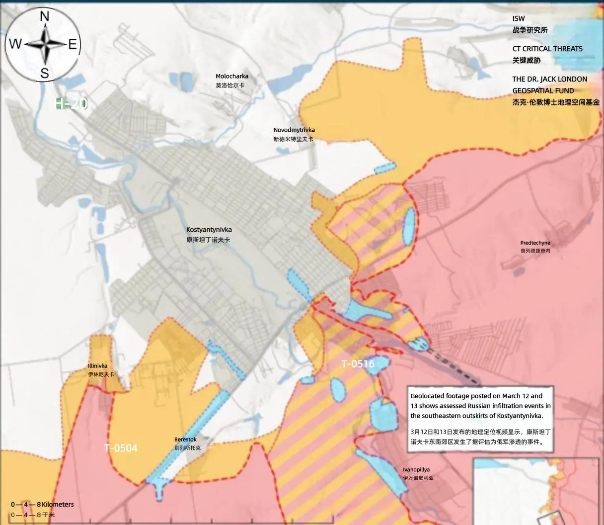 决战双子城之外围争夺:康斯坦丁诺夫卡成双方争夺焦点 过去24小时,俄乌双方共发生144次战斗,其中康斯坦丁诺夫卡方向以28次交战成为整个前线烈度最高、争夺最胶着的核心战场。 在斯拉维扬斯克东北及利曼周边,俄军于3月13日至14日持续发起多点进攻。俄方消息称,乌军在局部地区实施反击遏制俄军推进。 3月14日,乌军某旅发言人称,斯拉维扬斯克方向俄军一线作战部队已近乎耗尽,被迫将后勤人员投入冲击与小组渗透任务;俄军在得到补充后正逐步增加冲击次数,但兵员训练水平低下,主要依托夜间渗透+反热成像伪装隐蔽接近,并用简易桥架设法渡过巴赫穆托夫卡河。 地理定位视频显示,俄军第123摩步旅(第3合成集团军)无人机部队在里兹尼基夫卡西侧打击乌军阵地;第9工兵团FPV无人机、“斯穆良卡”支队与“鲁比孔”无人机中心则分别在北顿涅茨克西北尼古拉耶夫卡、利曼西北新谢利夫卡引导空天军空袭,构成“无人机侦察+精确打击”的战术组合。 乌方“阿泰什”游击队通报,因车辆损失激增,俄军正将斯拉维扬斯克、北顿涅茨克方向作战车辆后撤至纵深区域,涉及北顿涅茨克、克雷明纳、别洛戈罗夫卡,向利西昌斯克、北顿涅茨克转移,间接反映该方向俄军前沿补给与机动压力显著上升。 康斯坦丁诺夫卡作为双子城南部关键屏障,成为本轮对抗的绝对重心。俄军在康斯坦丁诺夫卡城区、东北、东南、城南、西南,以及德鲁日科夫卡以南、西南全线施压。俄方战地博主称,乌军在康斯坦丁诺夫卡以南发起反冲击,伊利因卡已沦为双方反复拉锯的“灰色地带”。 3月13日地理定位视频显示,俄军在霍卢比夫卡(康斯坦丁诺夫卡东北)中心地带O-0508公路附近、康斯坦丁诺夫卡城东及东南郊实施渗透行动,随即遭乌军火力清除。 乌军在康斯坦丁诺夫卡方向的某旅发言人指出,天气转好使俄军FPV无人机活动加剧,但KAB制导滑翔炸弹打击强度并没有提升;克拉马托尔斯克方向乌军连长透露,乌军正以敌后渗透战术夺取战术主动权,有效干扰俄军春夏攻势筹备。 (本文部分参考战争研究所报告)