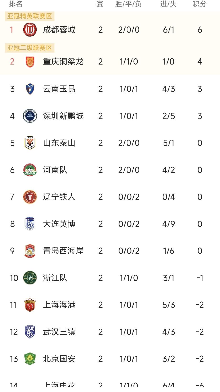 成都蓉城1比0小胜青岛海牛,高居积分榜第一! 中超联赛第二轮最后一场,成都蓉城队主场1比0小胜青岛海牛队。 蓉城目前名列中超积分榜第一,领先争冠对手山东泰山队6分,领先浙江队7分,领先海港、北京队8分,领先申花队12分! 简单的说说本场比赛: 1,作为一支以争冠为目标的球队,为什么主场只胜了以保级为目标的青岛海牛队1个球? 蓉城队今晚获得了很多得分机会——罗慕洛、韦世豪攻门击中立柱,韩鹏飞空门不进,另外海牛门将牟鹏飞今晚贡献了七次神奇扑救! 2,蓉城中锋费利佩在赛前训练中,小手指受伤,缺席了本场比赛,对球队还是有一定影响。 3,89分钟,蓉城队用李扬换下了空门不进的中后卫韩鹏飞! 按惯例,球队一般情况下不会换的位置是门将和中后卫! 一定要说短板,蓉城队目前备受争议的就是中后卫韩鹏飞这个位置! 个人认为韩鹏飞能入选国足,实力没有问题,但上赛季很少的出场时间,影响了他的状态,应该可以多给他点时间!