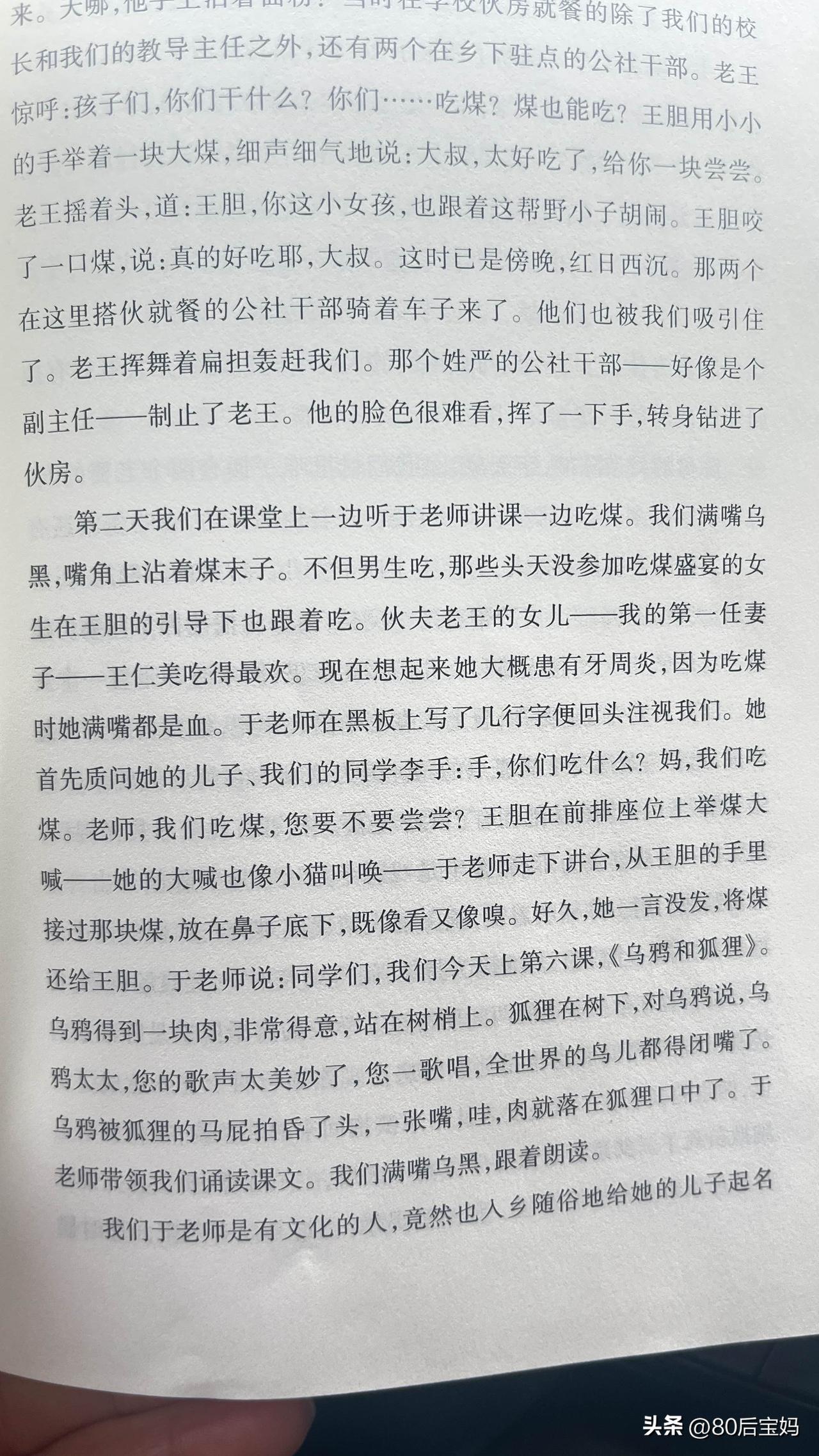 今天是3月15日,周日。 周末的时间基本上都是属于孩子的,所以今天下午2:00到5:00是她田径训练的时间。 训练的地方离家有点远,我通常在车里等她。这三个小时里,我有时候刷刷手机,有时候看看书。 今天带的是莫言的《蛙》这本书,不知不觉从第1页看到了第26页。 读到两处地方,让我印象特别深。 他们那个年代农村孩子取名的习惯。村里很多人的名字都是按人体器官来取的,比如王肝、王脚、王胆,陈鼻、吴肠之类的。 现在看起来有点奇怪,可在那个年代名字好像只是一个简单的符号能叫的响,能记得住就行。 另一处更让人唏嘘。书里写道,在物质极度匮乏的年代,人饿到不行的时候呢,甚至会去吃煤。读到这里的时候,心里有点说不出的感觉。 我们这一代人,很难想象,那时候人是怎样熬过那些日子的。 车窗外,是操场上奔跑的孩子;车窗内,是书里那个遥远又真实年代。 一边是充满活力的现在,一边是艰难生存的过去。 有时候读书最大的意义也许就是让我们知道:今天看似平常的生活,其实来得并不容易。 你们平时会在等孩子的时候看看书吗