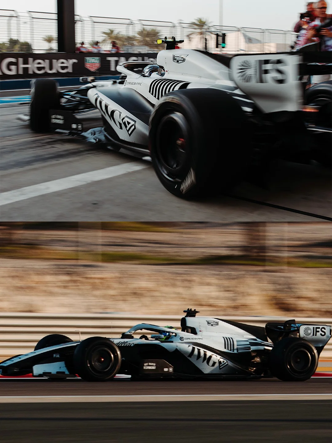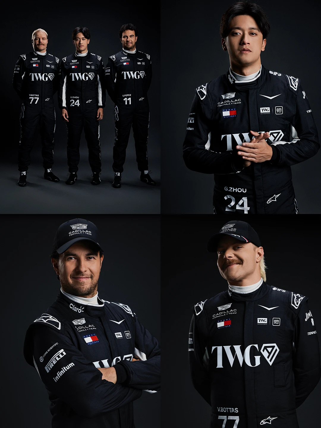 周冠宇、切科·佩雷兹、瓦尔特里·博塔斯三位车手出镜的型录,每一套都精准踩在经典学院风与F1速度感的交汇点上——