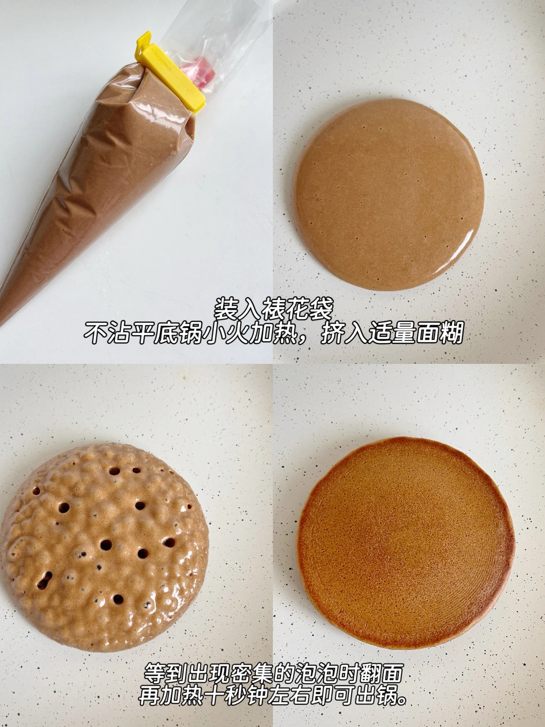 4️⃣不沾平底锅小火加热,挤入适量面糊,等到出现密集的泡泡时翻面,再加热十秒钟左右即可出锅。