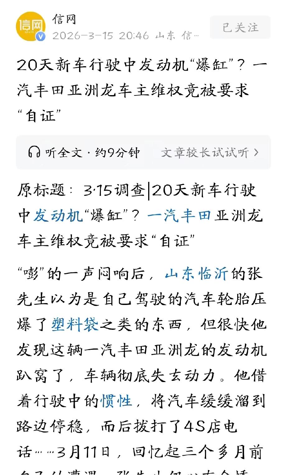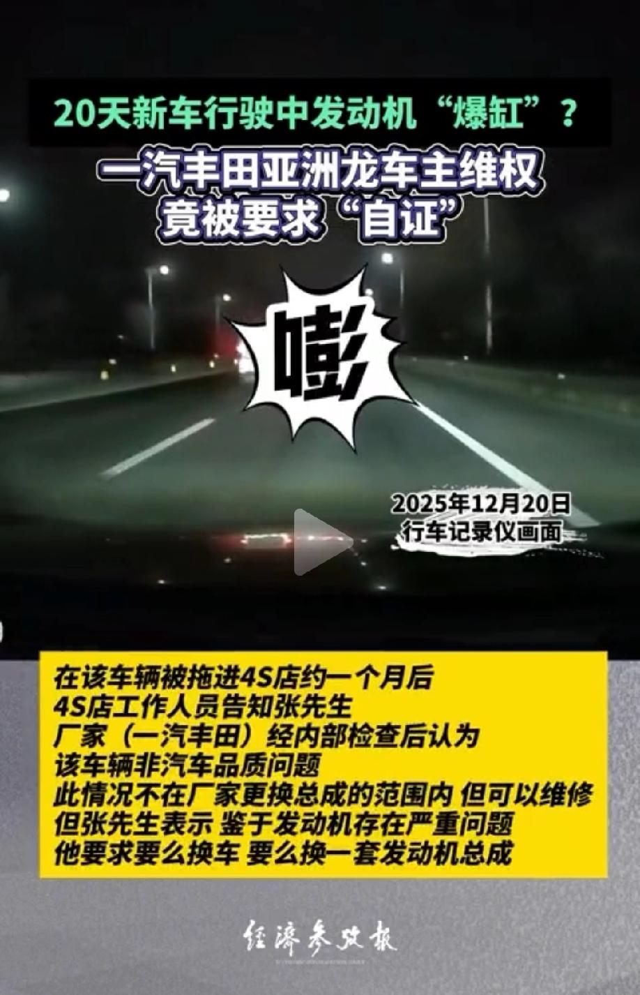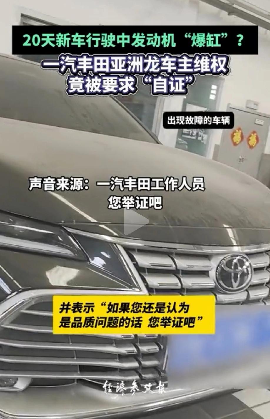 吃相太难看了!山东临沂,男子家购买了一辆丰田汽车,刚提车20天,累计行驶900多公里,这辆新车突然出现发动机爆缸,抛锚在半道上。男子要求不高,只希望4S店给他更换发动机总成,或者退车,没想到,看似这么合理的要求,却遭到拒绝,厂家表示:车辆发动机爆缸不是质量问题,拒绝出具鉴定报告,反而要求男子自证车辆有问题。男子傻眼了,新车发动机爆缸,厂家难道不应该自证清白吗? 张先生怎么也没想到,自己家刚买的丰田亚洲龙新车,才开20天、跑了900多公里,就直接在半路上发动机爆缸抛锚。 更让他憋屈的是,维权时厂家不仅不认是质量问题,还让他自己找证据证明车有毛病。 2025年11月29日,张先生的妻子刘女士花了近17万元,在临沂某丰田4S店提了一辆2024款丰田亚洲龙2.0L HEV豪华版。 这车当时是丰田的畅销款,夫妻俩对比了很久才选定,原本打算用来日常通勤,满心欢喜等着新车代步。 可这份开心没持续多久,仅仅20天后,张先生就遭遇了一场意外。 2025年12月20日晚上7点半,张先生开着这辆新车从临沂市区回郯城县,路上突然听见“嘭”的一声闷响,他一开始还以为是轮胎压到了塑料袋,可下一秒车子就彻底没了动力。 幸好当时车速不快,张先生赶紧靠着惯性把车溜到路边,反复尝试启动都没反应,只能慌张地拨打4S店电话求助,最后车子被4S店拖回了店里。 第二天4S店检查后告诉张先生,车子是发动机爆缸了,缸体被连杆直接打破,问题很严重。 张先生清楚的记得,当时4S店还说,这大概率是质量问题,厂家应该会给更换发动机总成。 这话让张先生心里稍微踏实了点,可没想到这一等就等了快二十天。 这期间,厂家一直没派技术人员过来,4S店也没给他提供代步车,更没给过代步补偿,这让张先生心里渐渐犯了嘀咕。 更让他彻底傻眼的是,车子拖进4S店一个月后,4S店突然转达了厂家的说法:车辆发动机爆缸不是质量问题,是进水导致连杆弯曲断裂,他们只同意维修。 张先生当场就气坏了,车子提车后只在市区通勤,当地那段时间根本没下雨,车辆也从没涉水,空气滤芯也没有一点水渍和污泥,怎么可能是进水导致的? 张先生坚持自己的合理诉求,要么换发动机总成,要么直接退车,可厂家始终不松口。 厂家不仅拒绝出具正式的鉴定报告,甚至很直白地让张先生自己举证车辆有质量问题。 明明是新车出了严重故障,反倒要张先生自证清白,他越想越觉得不合理,无奈之下只能向法院提起了诉讼,还为此花了一万多元请了律师。 更让张先生觉得4S店没有诚意的是,他刚递交起诉书、支付完律师费,4S店又突然同意免费更换发动机总成。 可此时已经产生了一万多的律师费,张先生的诉求也很简单,要么退车,最低也要更换发动机总成,同时4S店承担维权产生的这些额外费用。 其实买过车的人都清楚,提车不到一个月,还在法定六个月举证责任倒置期内,按照规定,应该由厂家和4S店举证车辆没有质量问题,而不是让车主举证。 如果是涉水导致的故障,空气滤芯会有明显水渍,车辆也不可能开900公里才爆缸,厂家仅凭内部判断就定性,实在难以服人。 如今距离车辆故障已经过去两个多月,张先生的维权之路依旧没有结果,这厂家始终没有给出正式的鉴定报告和合理的解决方案。 目前,张先生只能寄希望于法院,希望能给他一个公道。 《消费者权益保护法》第23条明确规定:经营者提供的机动车等耐用商品,消费者自接受商品之日起六个月内发现瑕疵,发生争议的,由经营者承担有关瑕疵的举证责任。 本案中,张先生提车仅20天、行驶900余公里即发动机爆缸,尚在法定六个月举证责任倒置期内。 厂家以“进水”为由否认质量问题并要求车主自证,于法无据。 从法律角度而言,应该由厂家举证车辆非质量问题或瑕疵系消费者使用不当所致,其拒绝出具鉴定报告、推诿举证,已违反法定举证义务。 如果厂家不举证,必将面临举证不利的后果,必然要承担退换车等三包责任。