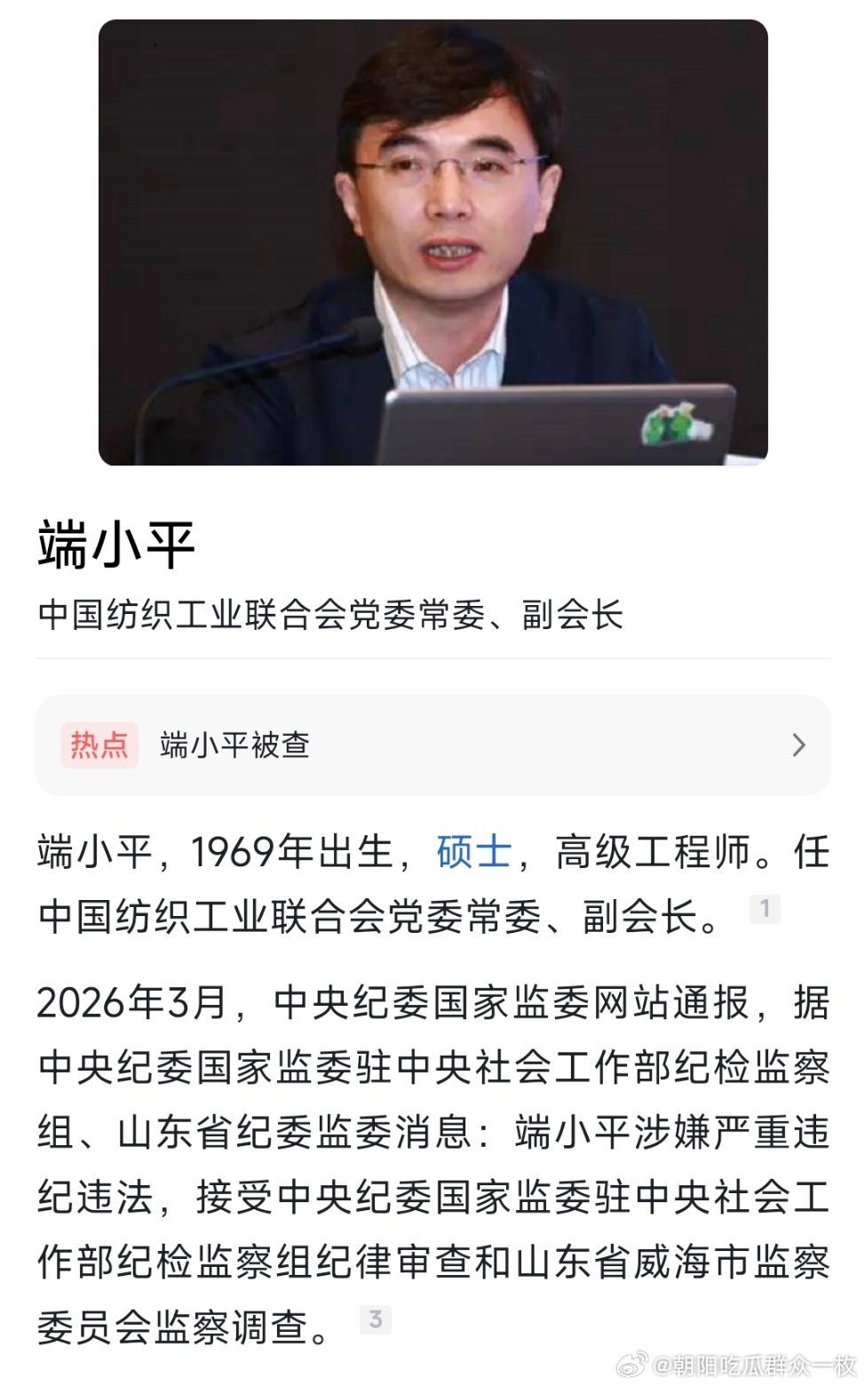 中国纺织工业联合会党委常委、副会长端小平接受纪律审查和监察调查。